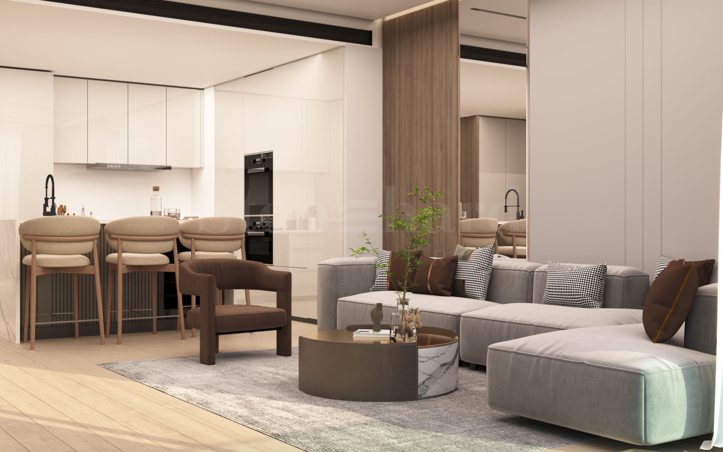 Die Wohnung wird komplett bezugsfertig angeboten, inklusive Eingangs- und Innentüren, Fußböden, Beleuchtung, Einbauküche und Badezimmer. Zu den verwendeten Materialien gehören Bianco-Marmor, fein gebürstetes Messing, warmes beiges Eichenholz und dekorative Tapeten, die eine hervorragende Grundlage für die individuelle Gestaltung nach den persönlichen Vorlieben der neuen Eigentümer bieten.