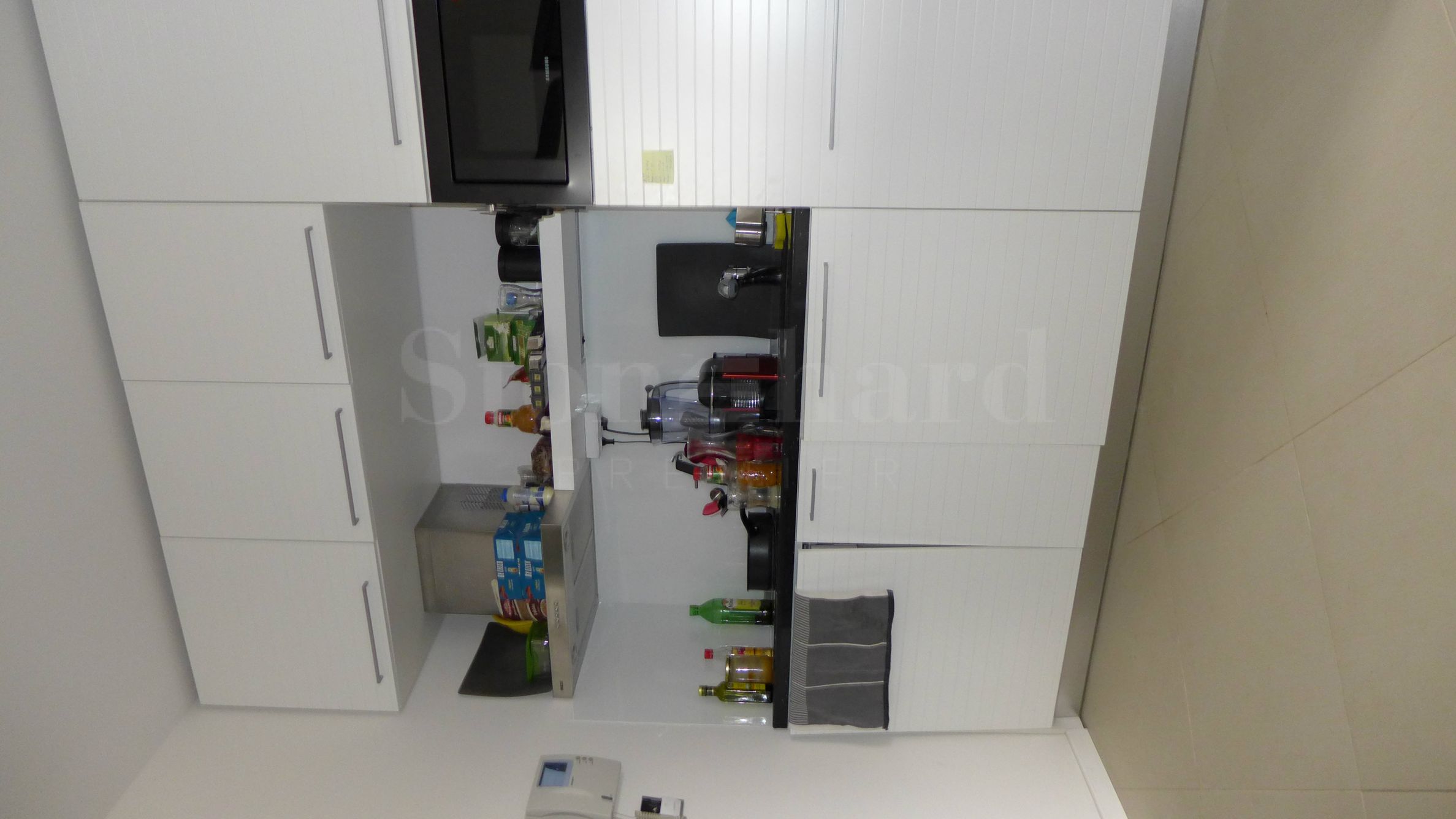 Die Wohnung hat eine Fläche von 125 Quadratmetern (101 Quadratmeter + 24 Quadratmeter Gemeinschaftsräume) und besteht aus einem Wohnzimmer, einer Küche mit Essbereich, zwei Schlafzimmern, zwei Badezimmern mit WC und zwei Terrassen. Es befindet sich in der vierten Etage und bietet einen atemberaubenden Blick auf das Meer und die Umgebung. Komplett mit stilvollen Möbeln eingerichtet.