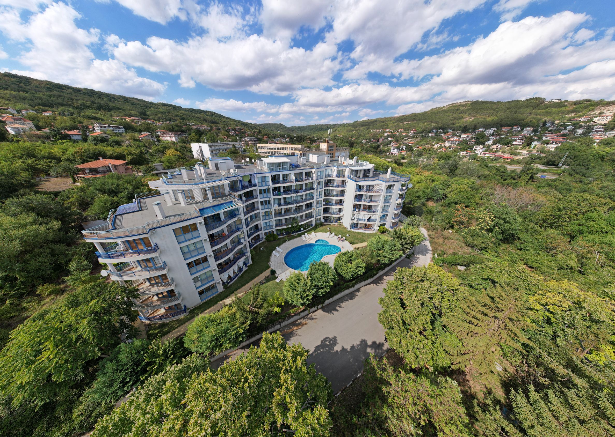 Der Komplex, in dem sich die angebotene Immobilie befindet, besteht aus zwei Spiegelgebäuden, die auf einem Grundstück von 2950 m² errichtet wurden. Die Gesamtzahl der Apartments beträgt 84. Zu den weiteren Annehmlichkeiten zählen ein Außenpool, ein Fitnesscenter und eine Bar.