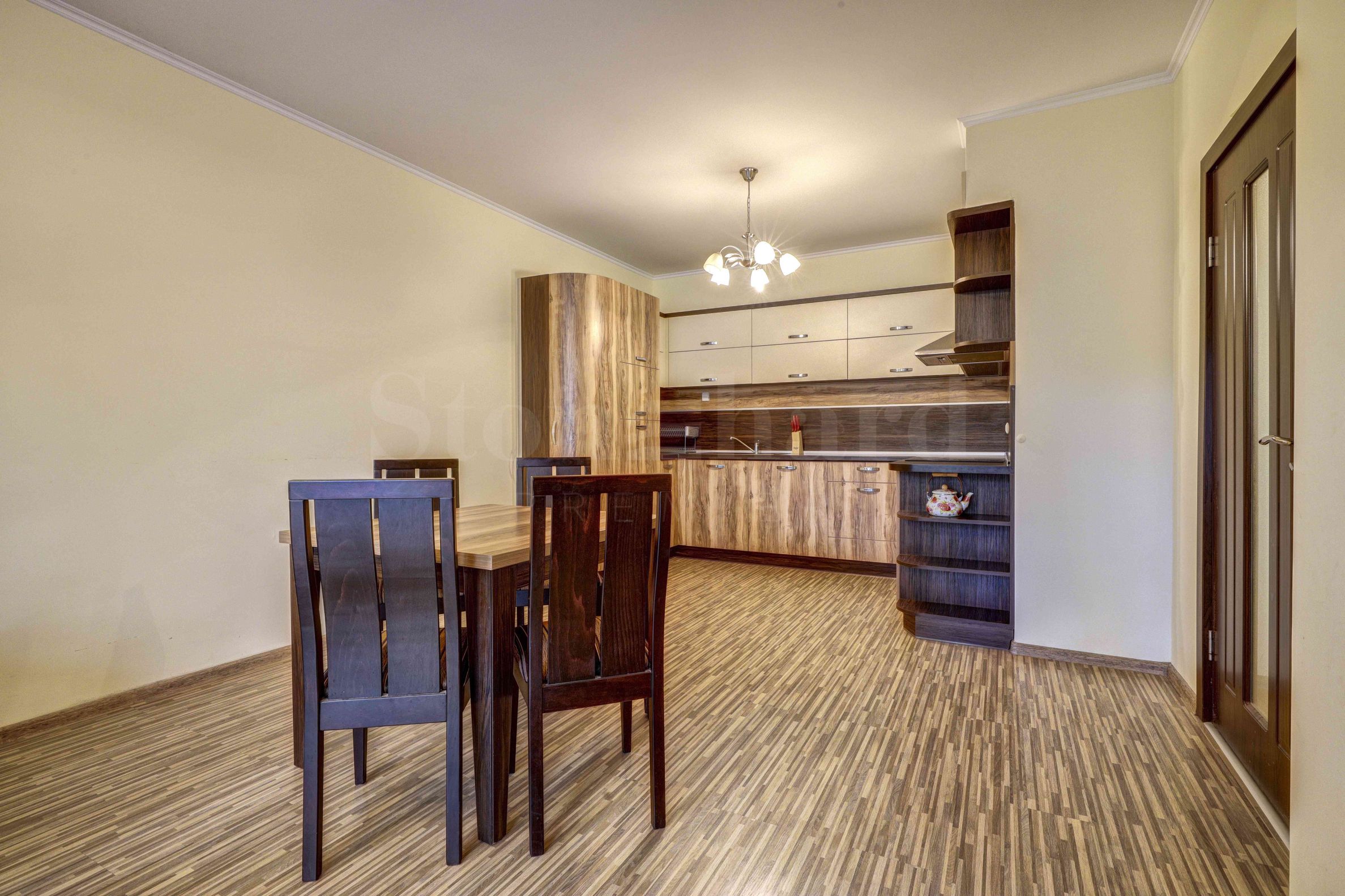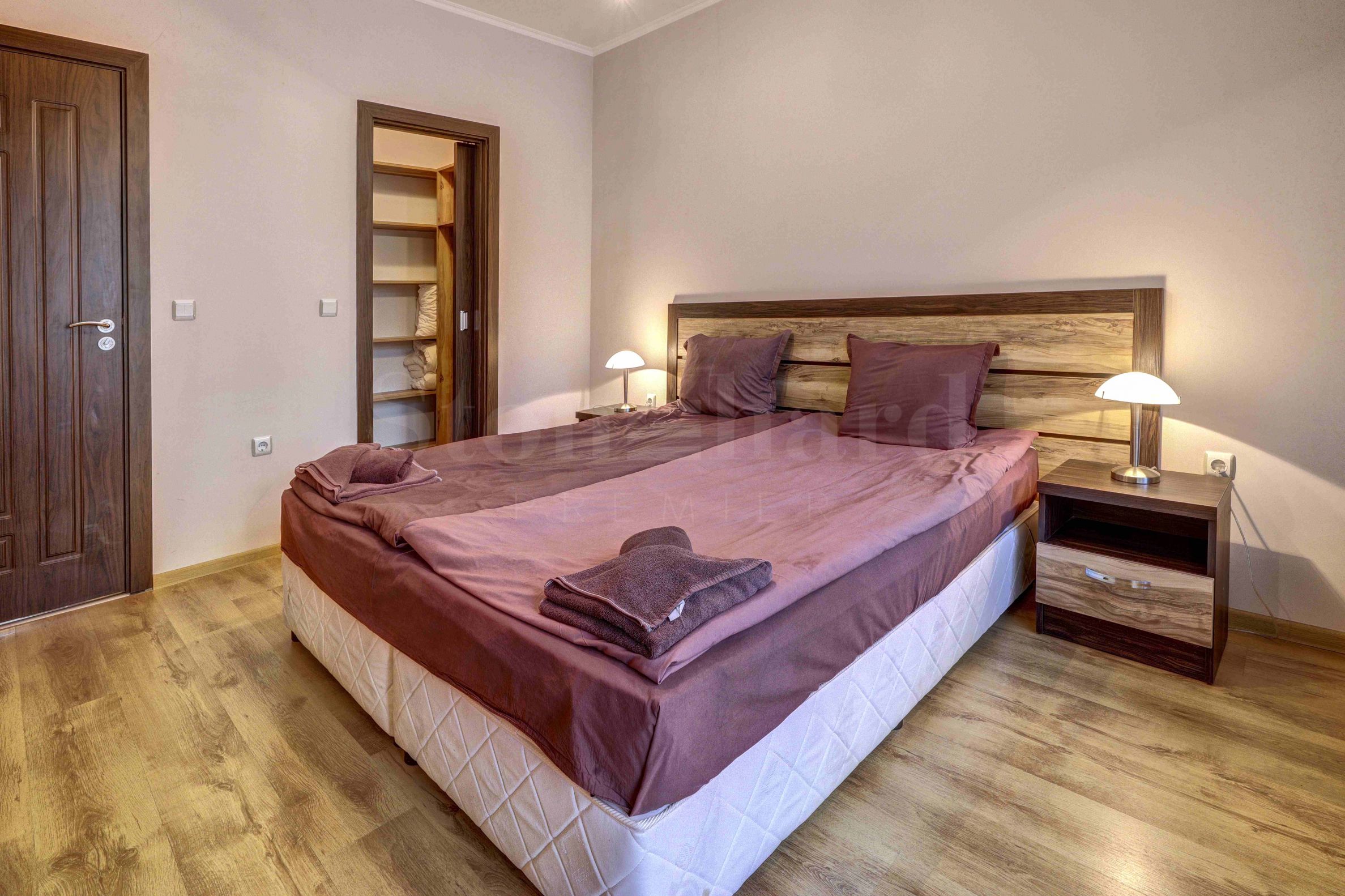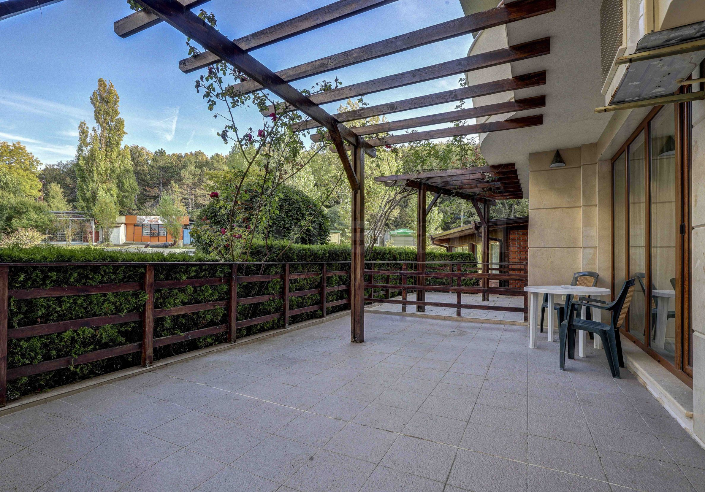Die stilvoll eingerichtete Wohnung befindet sich im ersten Stock, ist nach Südosten ausgerichtet und hat eine Fläche von 104 m². Es verfügt über ein helles und geräumiges Wohnzimmer mit Küchenbereich, und vom Wohnzimmer aus haben Sie Zugang zu einer großen Veranda, die von Hecken und einem dekorativen Holzzaun umgeben ist, wo Sie Ihren Morgenkaffee oder ein Familienessen genießen können. Das Schlafzimmer hat die gleiche Süd-Ost-Ausrichtung und bietet Zugang zur Veranda. Das Apartment bietet ein ausgestattetes Badezimmer mit einer großen Badewanne für besseren Komfort sowie einen Schrank für zusätzliches Gepäck.