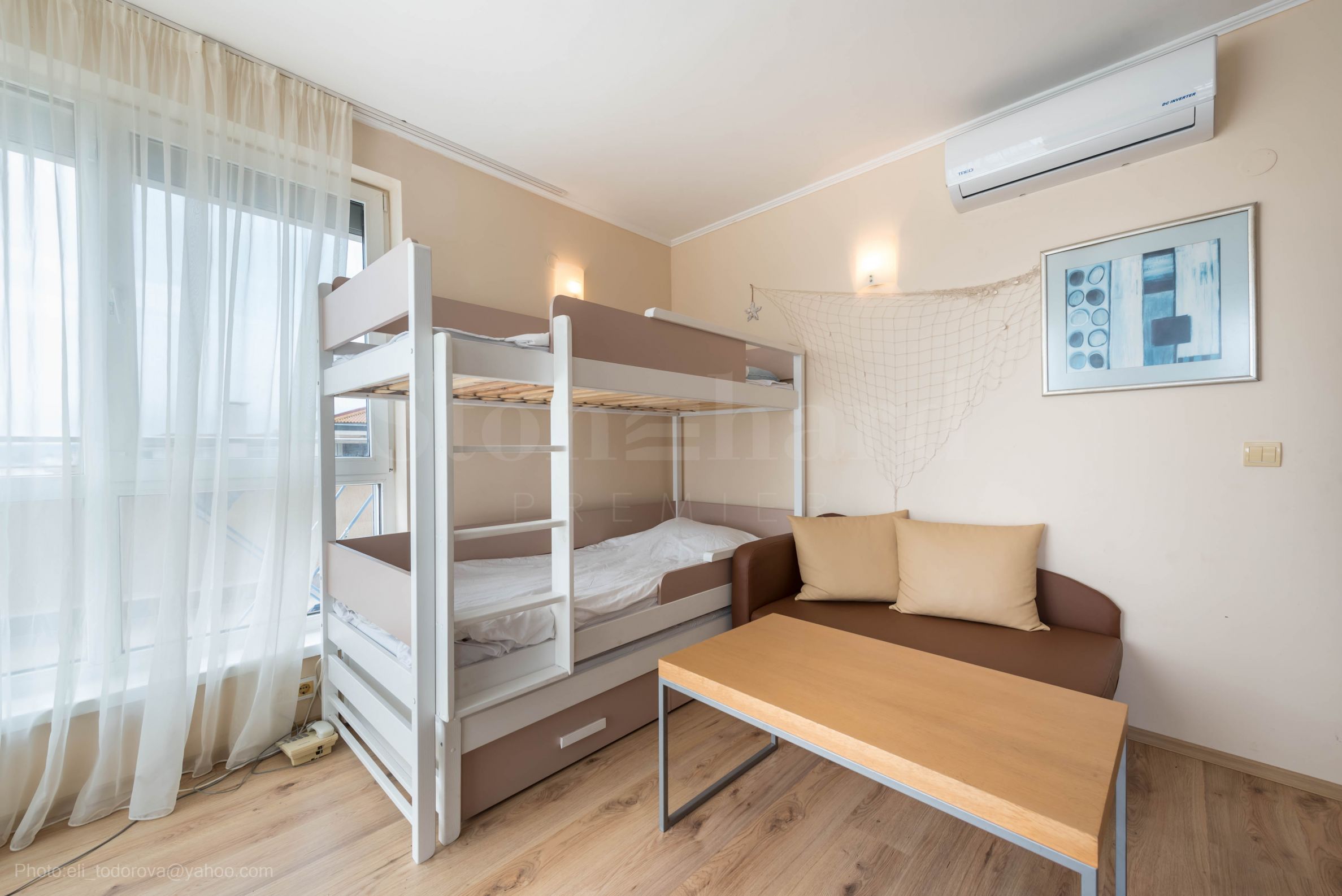 Die Wohnung befindet sich im fünften, obersten Stock und hat einen Frontblick auf das Meer und den Strand. Die Wohnung verfügt über eine beeindruckende Terrasse von 36 Quadratmetern, die einen Panoramablick auf das Meer und den Strand und die Hügel von Stara Planina bietet. Die Fläche des Anwesens beträgt 47,10 qm Wohnfläche und 36 qm Terrasse.