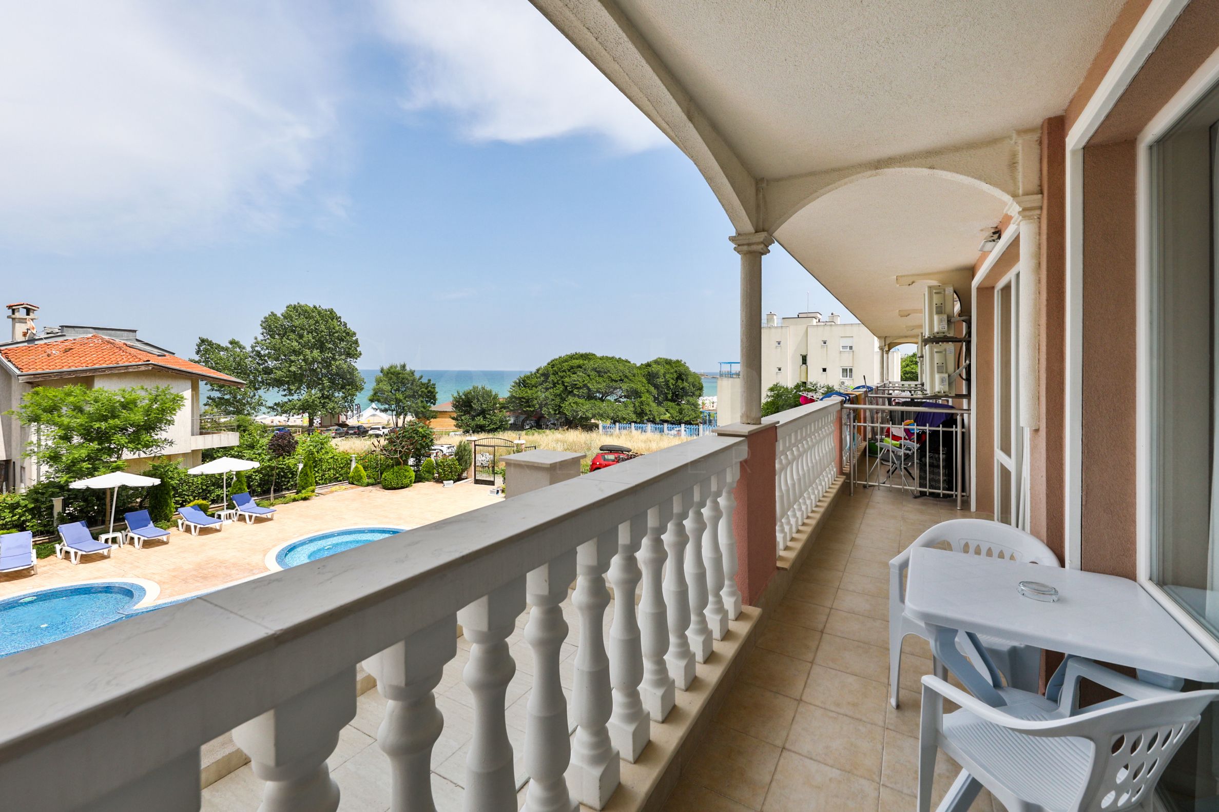 Die Wohnung verfügt über eine Terrasse mit wunderschönem Blick auf das Meer, den Strand und den Pool.