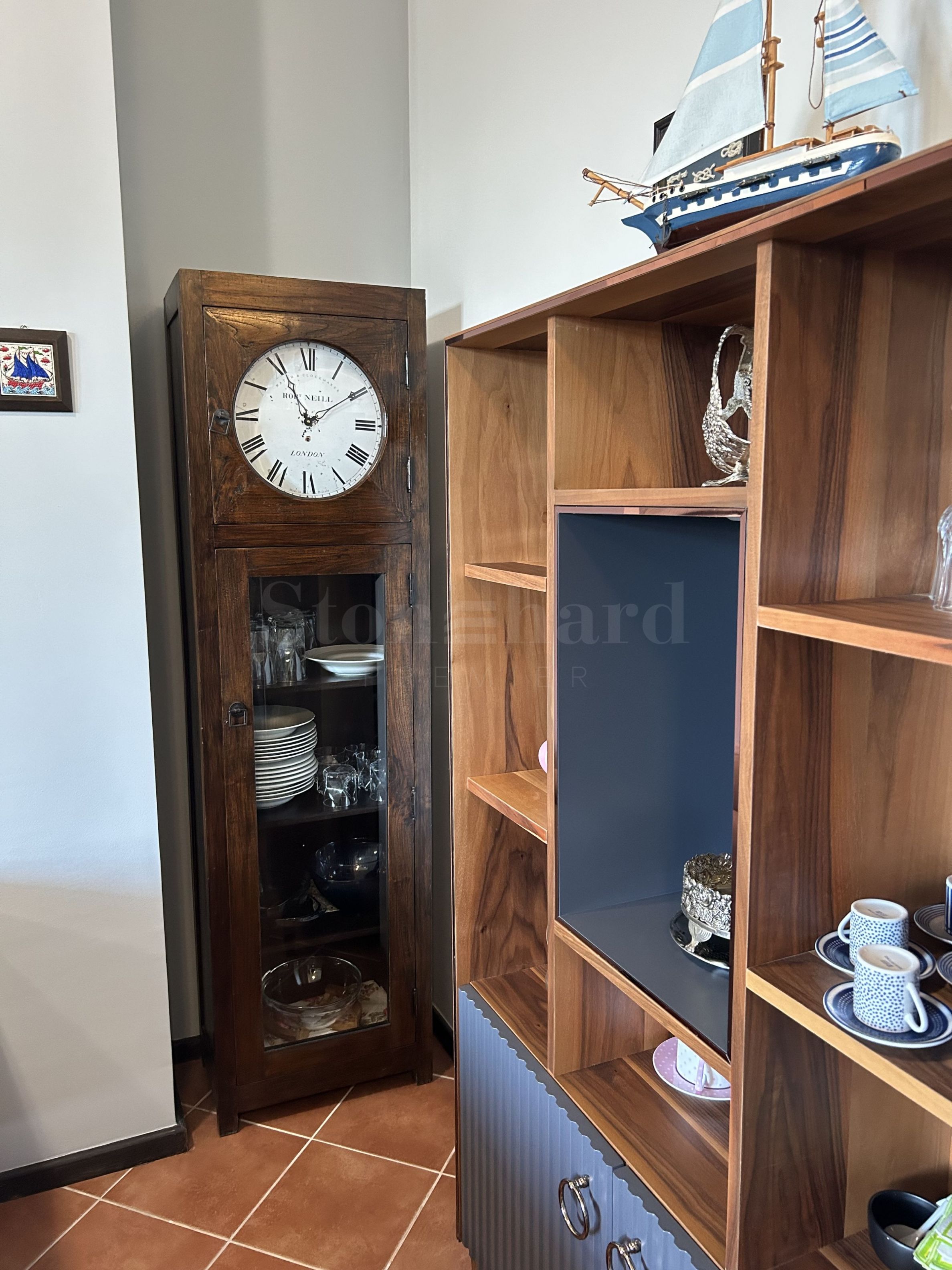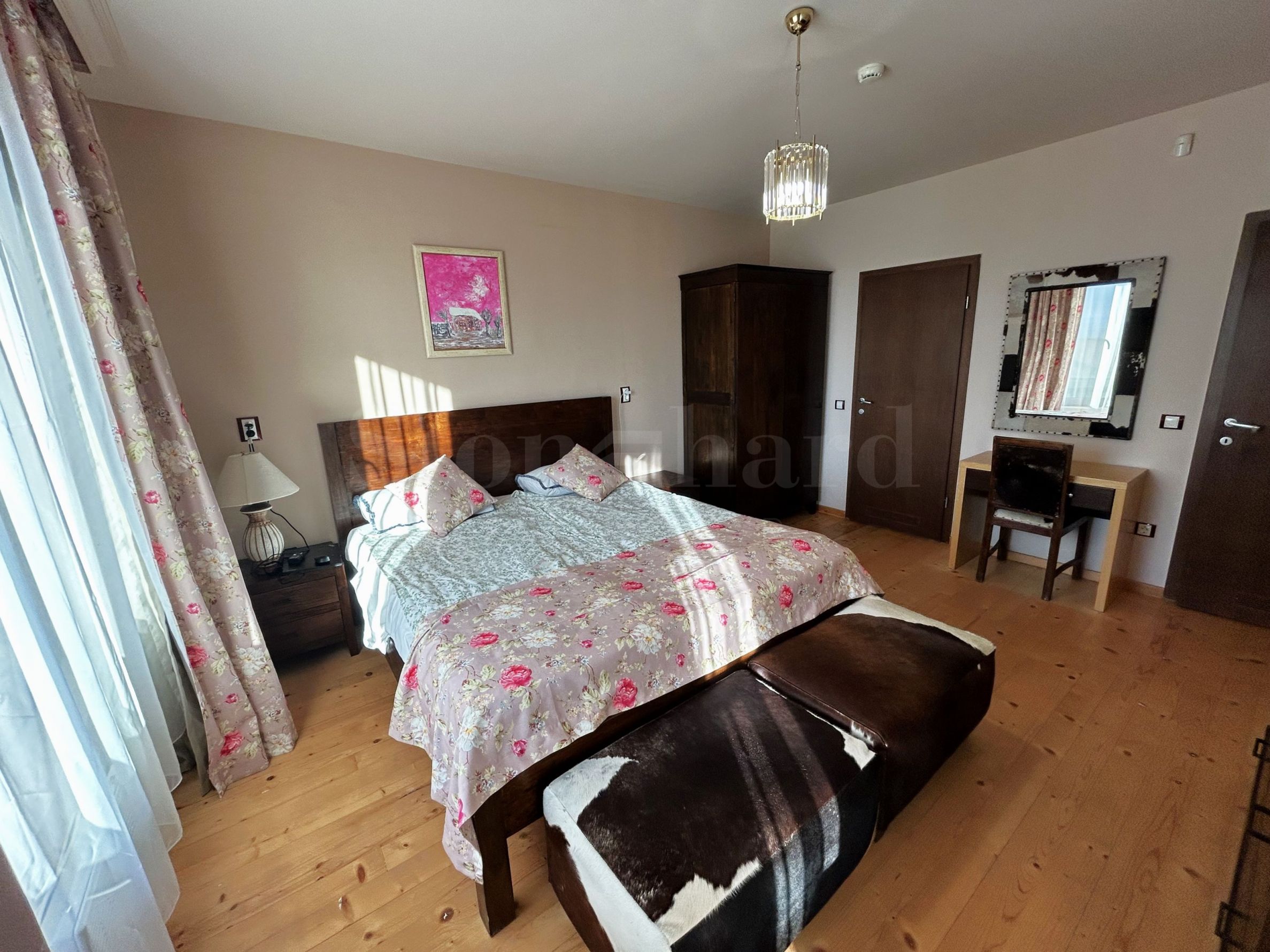 La maison est meublée avec des meubles anciens en bois naturel. Le bien est proposé à la vente avec le mobilier existant, sans les peintures.
