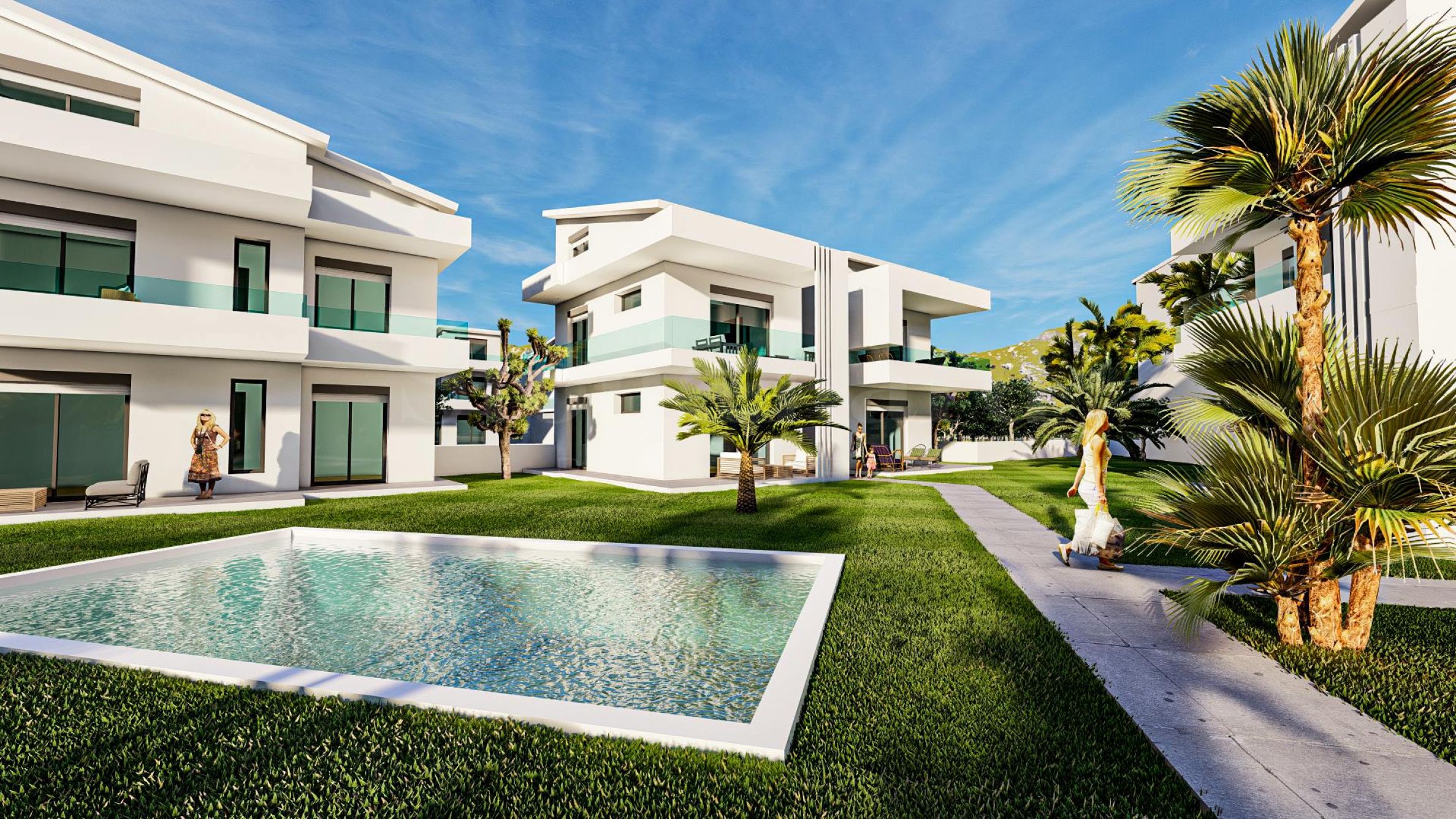 Chaque propriété est méticuleusement conçue dans les moindres détails - les maisons combinent des lignes épurées, des couleurs claires et de grandes fenêtres qui laissent entrer la lumière du jour dans les pièces. L'accent est mis sur le confort maximal, et à cet effet, chaque appartement dispose d'une terrasse où vous pourrez passer du temps le matin avec votre café ou le soir rencontrer des amis. Dans la cour du complexe, en plus d'un aménagement paysager riche, vous trouverez également des piscines extérieures partagées et des espaces de loisirs autour d'elles, qui sont un endroit idéal pour les familles avec enfants.