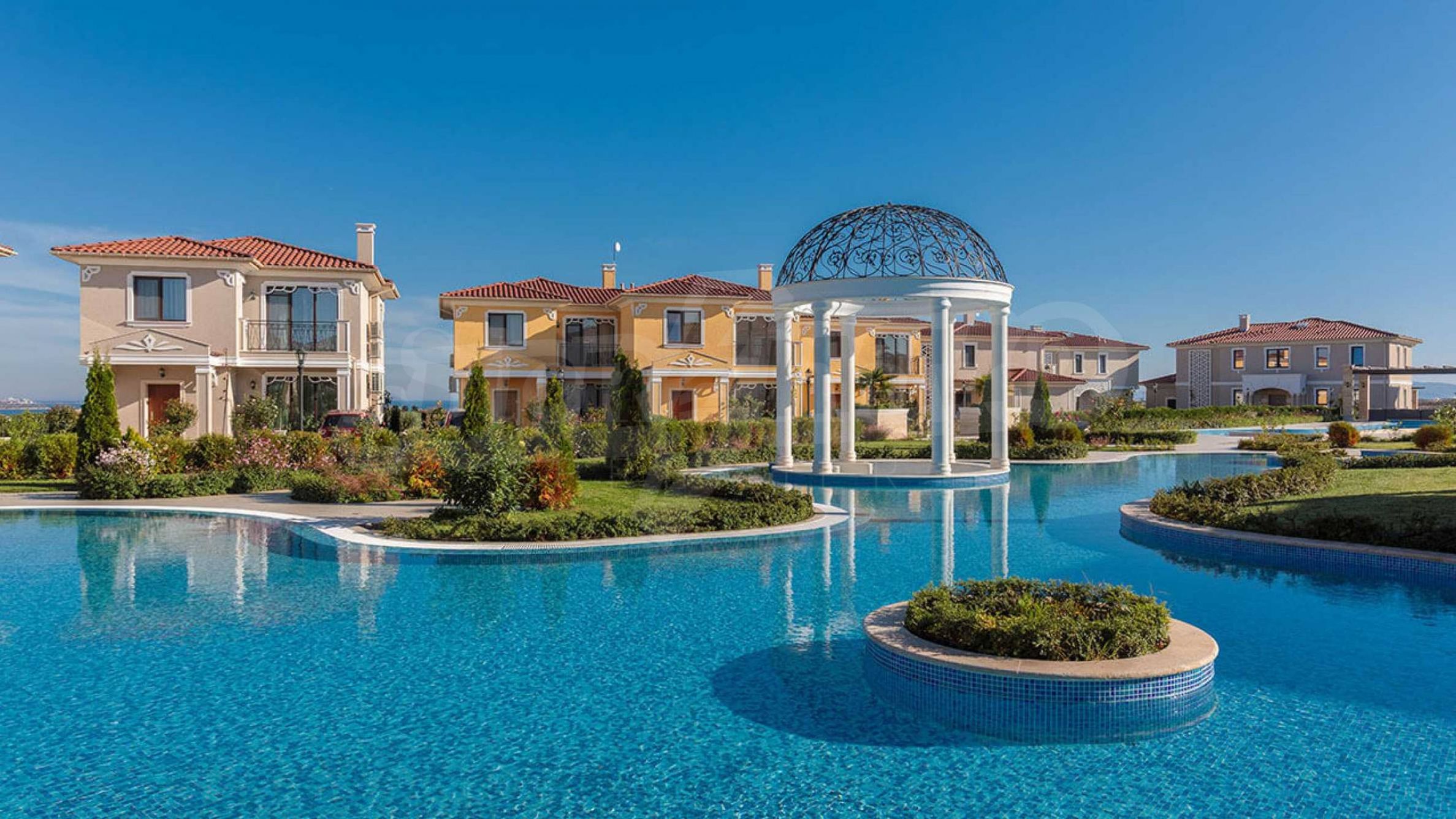 La maison fait partie d'une mini-station de villégiature composée de six complexes de luxe fermés, comprenant 135 maisons individuelles et maisons en rangée conçues individuellement, un endroit idéal pour une résidence secondaire ou des vacances d'été, chacune avec son propre jardin et places de parking, proche de Burgas (quartier Sarafovo) et avec un accès facile à la station balnéaire de Pomorie.