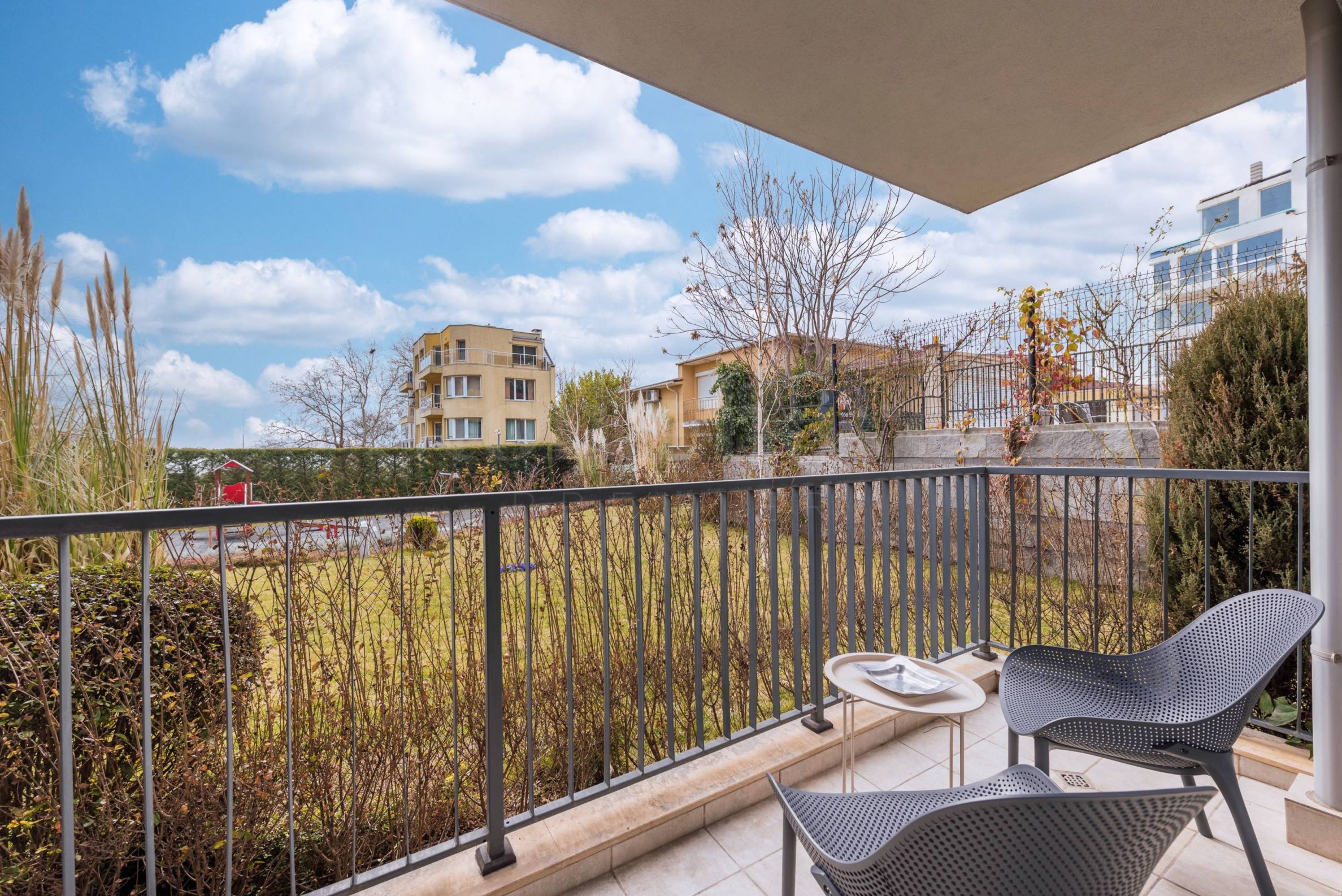 terrasse avec vue sur le jardin joliment paysagé et la piscine.L'appartement est élégamment meublé et équipé de tout le nécessaire pour vivre, y compris meubles et appareils électroménagers. Le chauffage est assuré par des climatiseurs inverter de haute qualité.