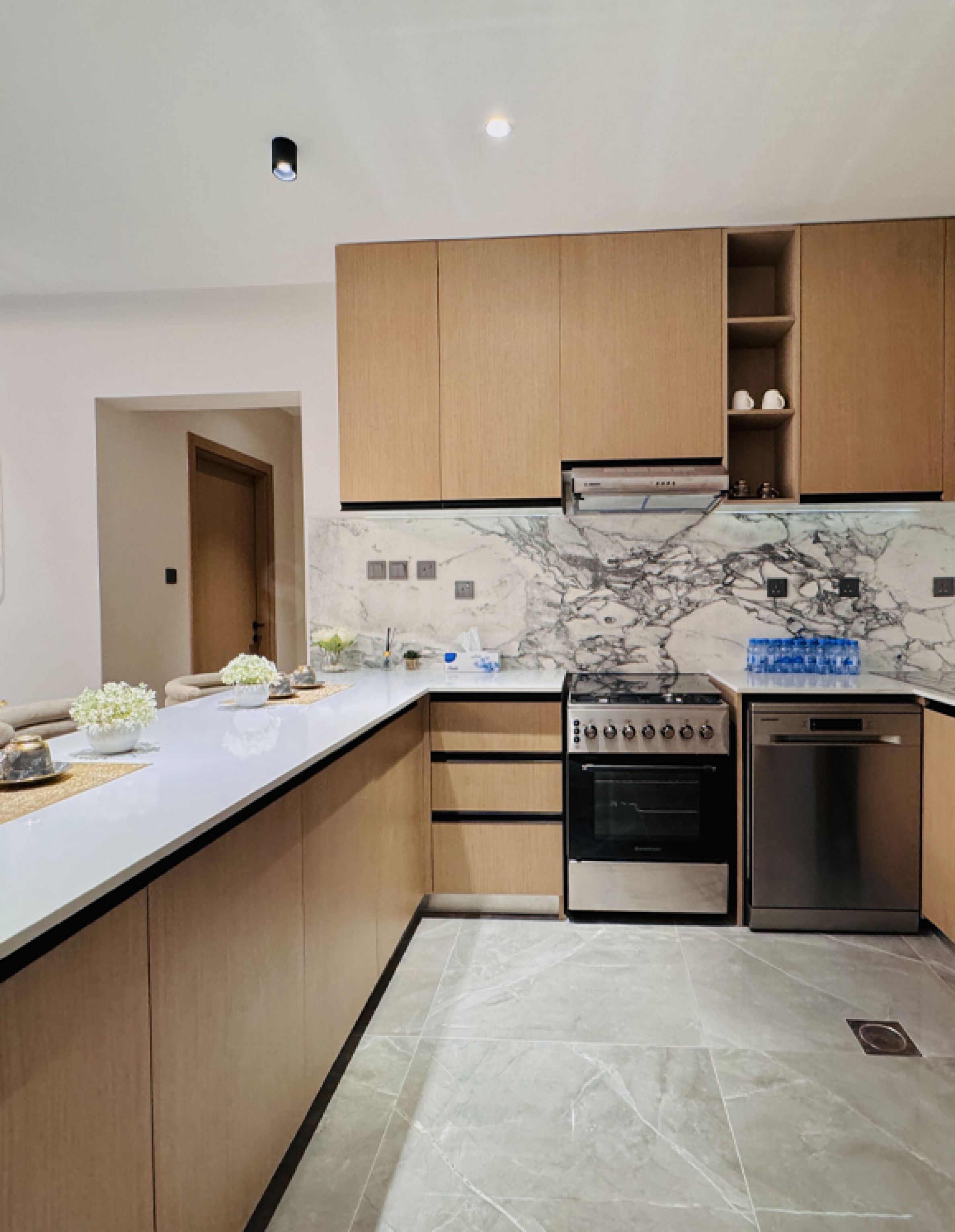 À Ajman Creek Towers, vous trouverez d'élégants appartements d'une, deux et trois chambres, conçus avec un souci du détail exceptionnel et une fonctionnalité optimale. Tous les logements sont livrés clés en main, avec des revêtements de sol de haute qualité, d'élégantes portes d'entrée et intérieures, des cuisines modernes et des salles de bains équipées. Les cuisines sont dotées d'armoires en bois foncé sur mesure qui s'intègrent harmonieusement à l'espace et soulignent l'esthétique de l'intérieur. Les salles de bains sont conçues comme de véritables oasis de bien-être, avec des pièces spacieuses et des lavabos et douches haut de gamme. Certains appartements disposent également de vastes terrasses, idéales pour se détendre avec vue.