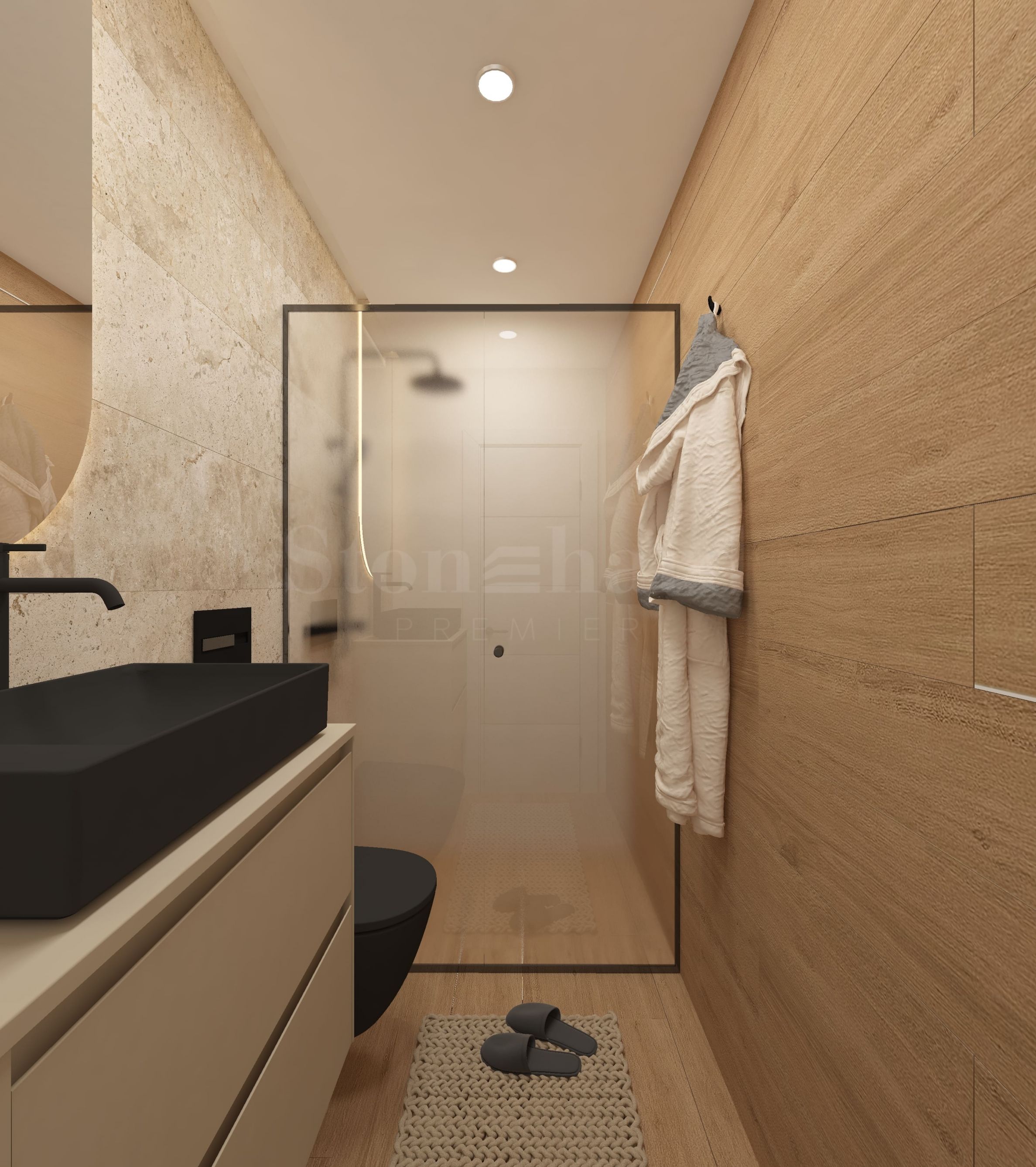 • salle de bain – grès cérame espagnol de Roca et Porcelanite Dos, qualité 1 ; structures encastrées de Roca, meubles Roca et sur mesure en MDF ;
