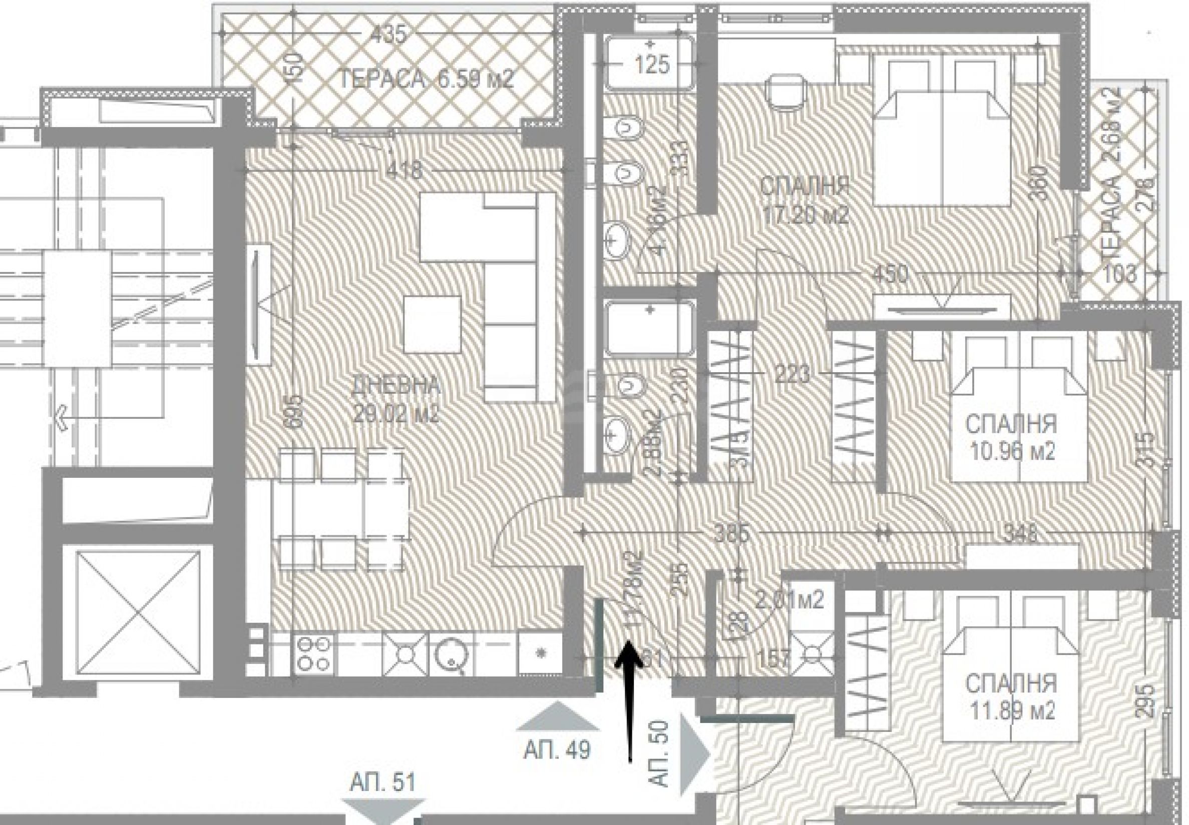 Surface totale du bien : 135,91 m². L’appartement est situé au 5e étage résidentiel sur 8 de l’immeuble, avec une exposition est et sud. Sur une surface construite de 103,74 m² sont répartis : hall d’entrée, séjour, cuisine et salle à manger avec accès à la terrasse, chambre parentale avec salle de bain attenante (avec fenêtre), deuxième chambre, deuxième salle de bain, deuxième terrasse et buanderie.