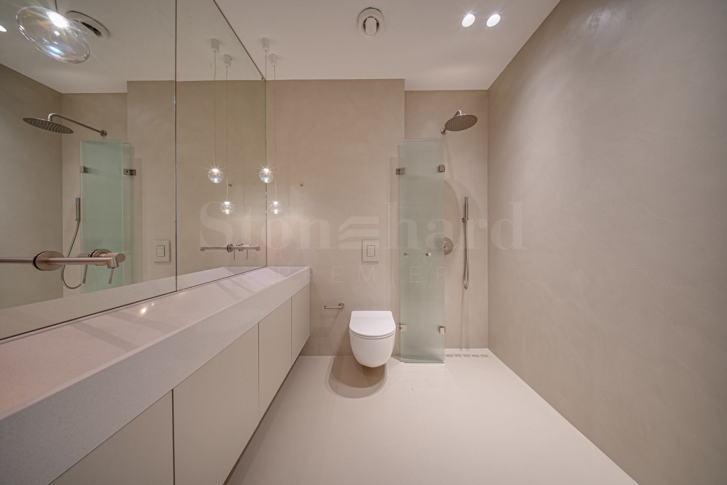 Le logement est proposé entièrement fini, avec une installation de chauffage au sol et une chaudière à gaz individuelle. La cuisine est équipée d'appareils électroménagers haut de gamme NEFF, et les revêtements de sol dans les pièces ainsi que dans les salles de bains sont réalisés en microciment élégant, soulignant la vision moderne de l'intérieur.