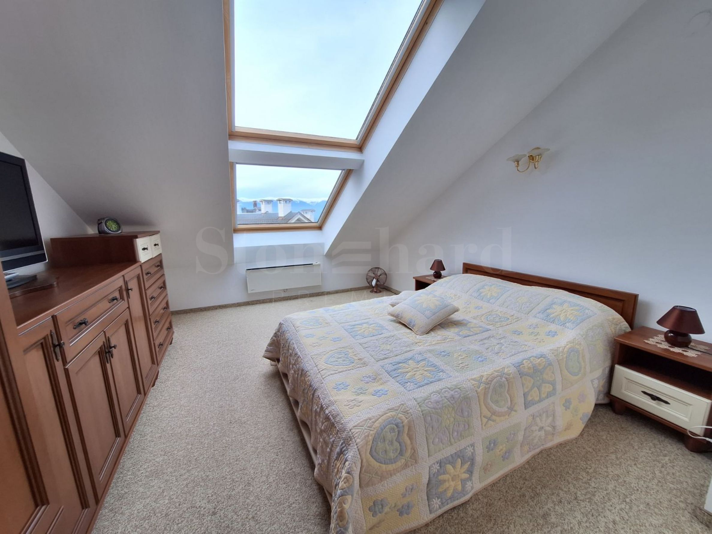 Le logement de vacances (2010), avec exposition nord et sud et une belle vue panoramique sur la montagne, est situé au 4ème étage avec une surface habitable de 114,50 m². La cuisine entièrement équipée comprend 4 plaques de cuisson, une hotte aspirante, un évier, un réfrigérateur, une bouilloire électrique, un grille-pain. Le salon - canapé, fauteuil, télévision, table basse, support TV, Wi-Fi, téléphone, réception, table à manger, 4 chaises, stores. Chambre 1 : lit simple, armoire à deux portes. Chambre 2 : lit double, 2 tables de chevet, armoire à deux portes, commode.