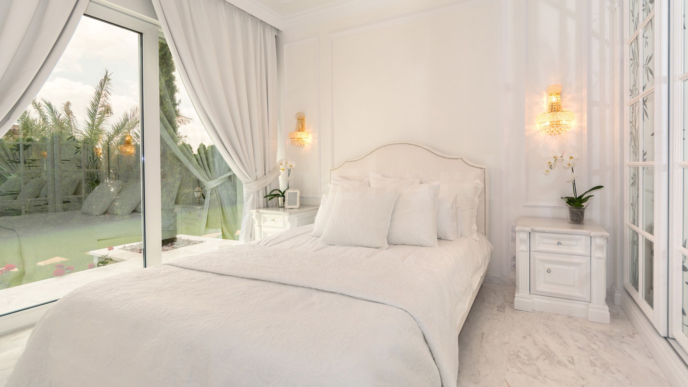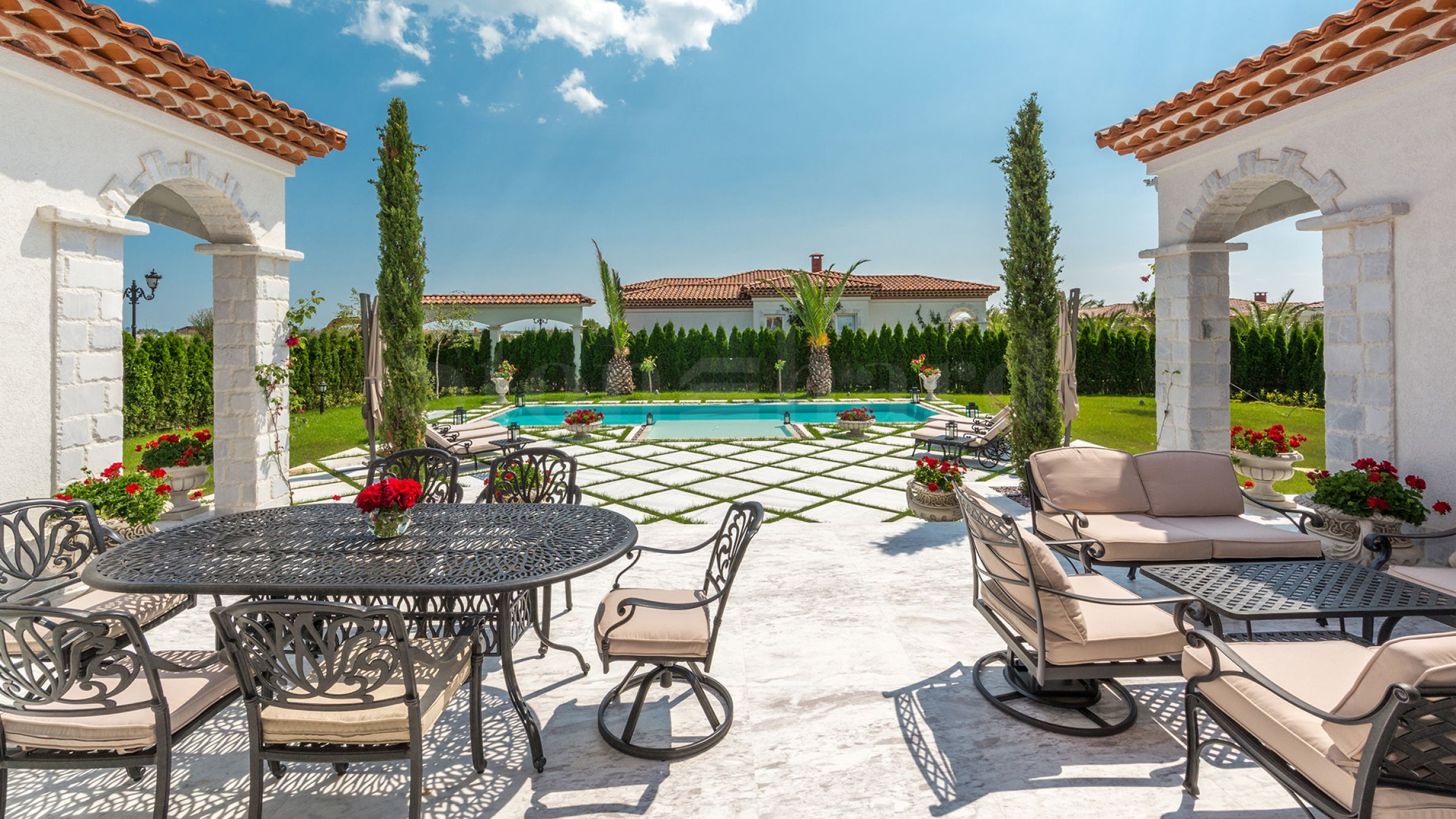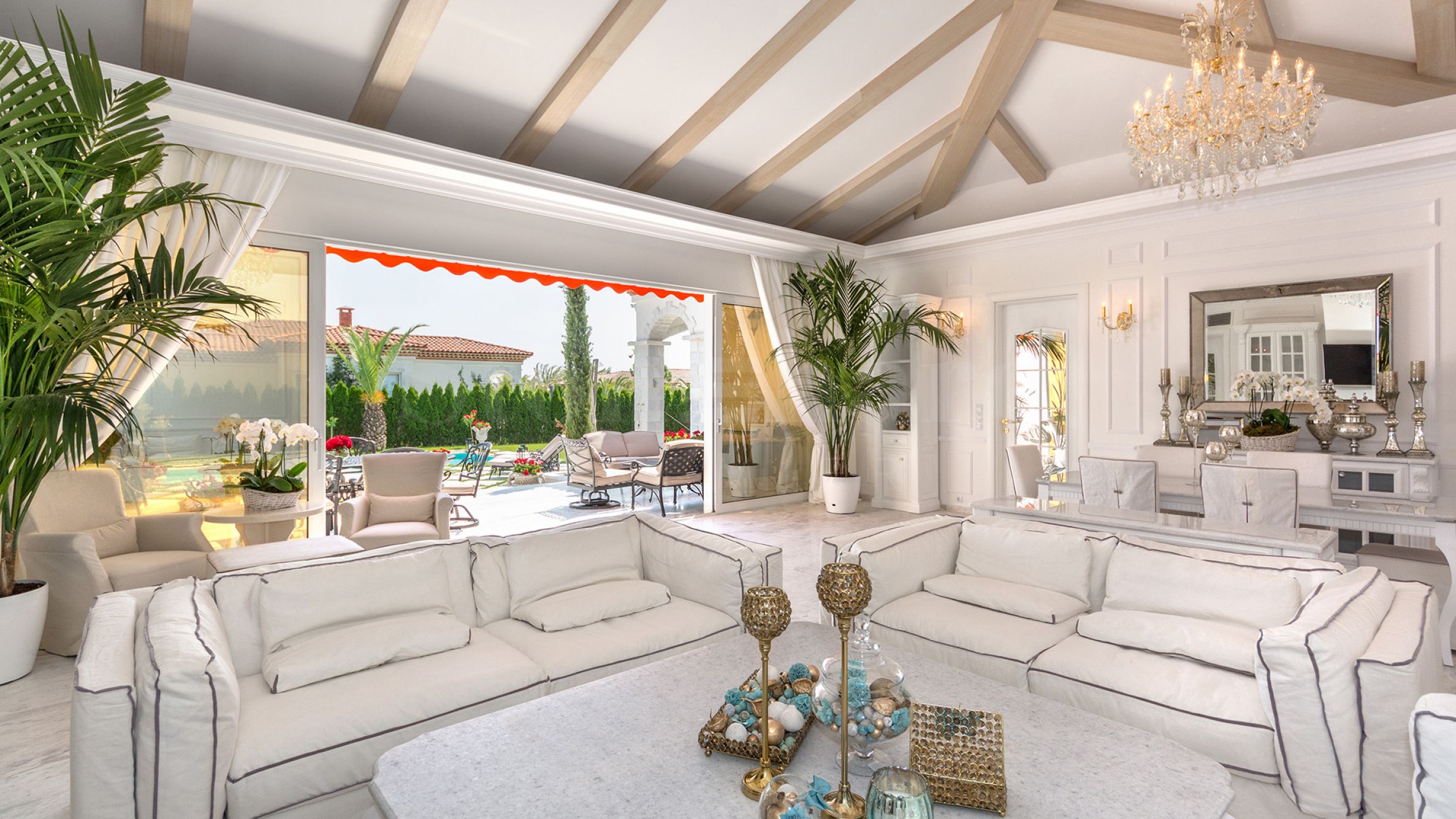 Après une entrée représentative, vous êtes accueilli par un salon spacieux. Le salon et la cuisine de la propriété sont des espaces ouverts, avec des espaces séparés pour manger, se détendre et une cheminée. Au sud, le salon s'ouvre entièrement sur la véranda par une grande fenêtre, un espace de transition unique idéal pour les soirées romantiques. Depuis la véranda, on accède directement à la piscine, située au centre du jardin et entièrement revêtue de marbre naturel Pyrgos Light.