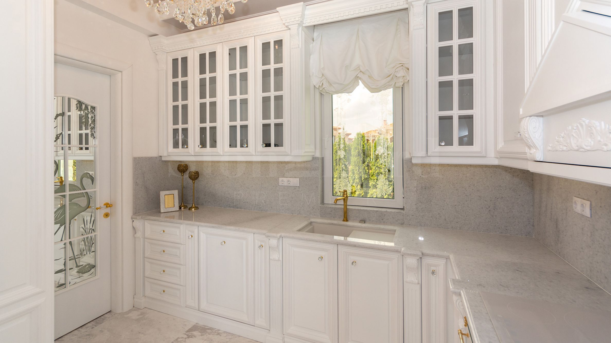 La maison est luxueusement et exquisément meublée, décorée de vitraux originaux et de meubles entièrement fabriqués individuellement. L'intérieur utilise des matériaux naturels de première qualité, ainsi que du marbre naturel Pyrgos Light.