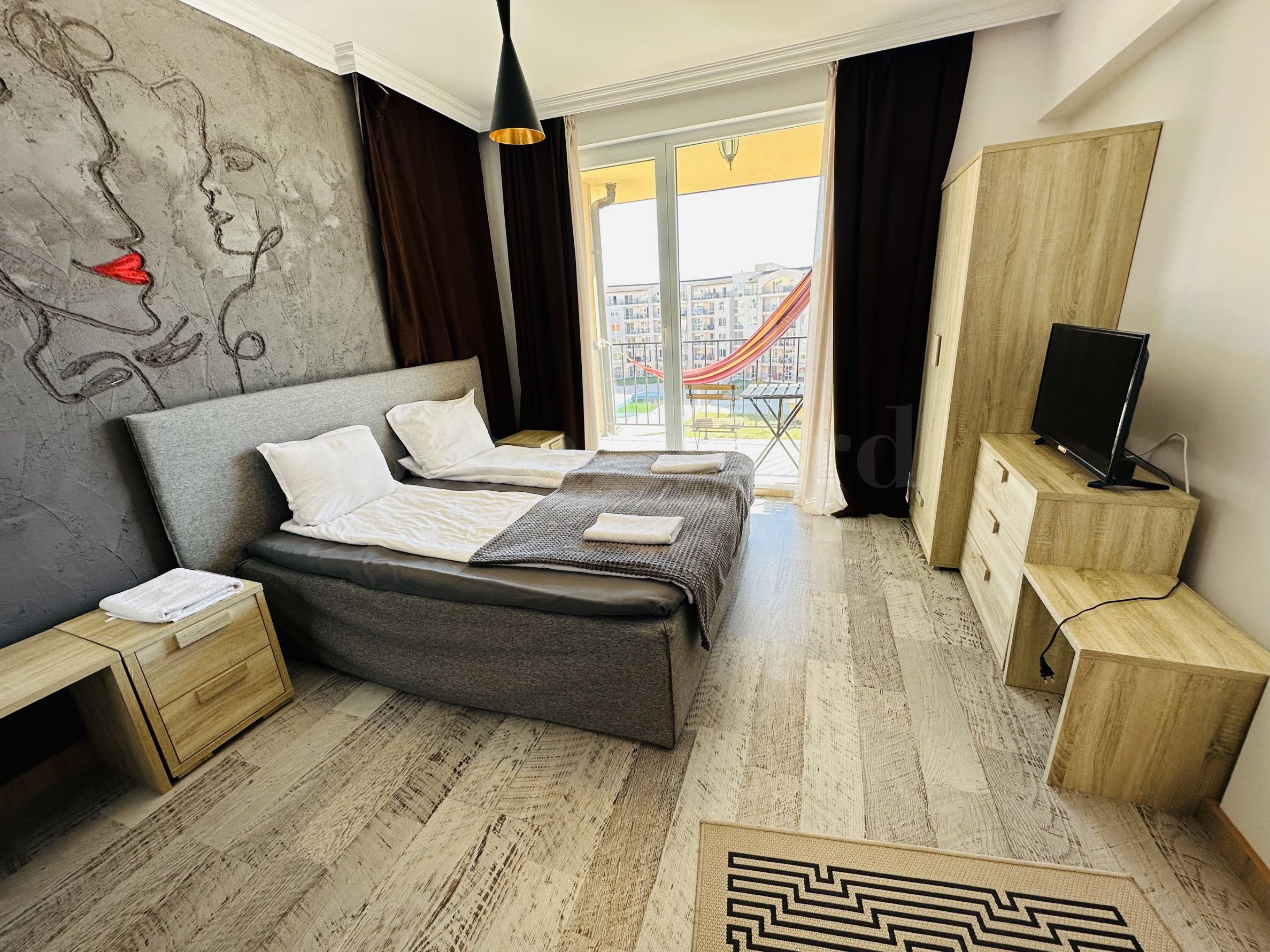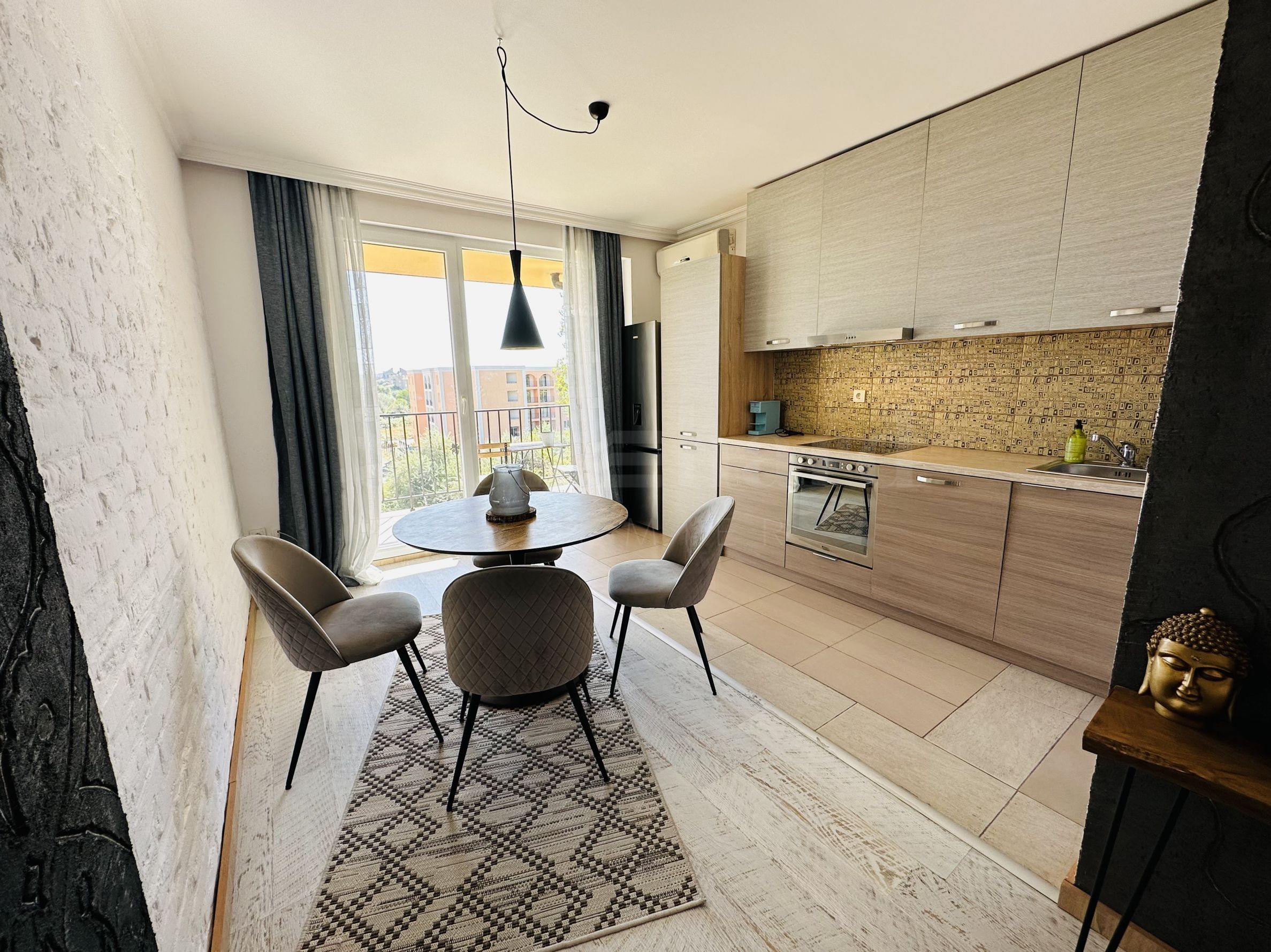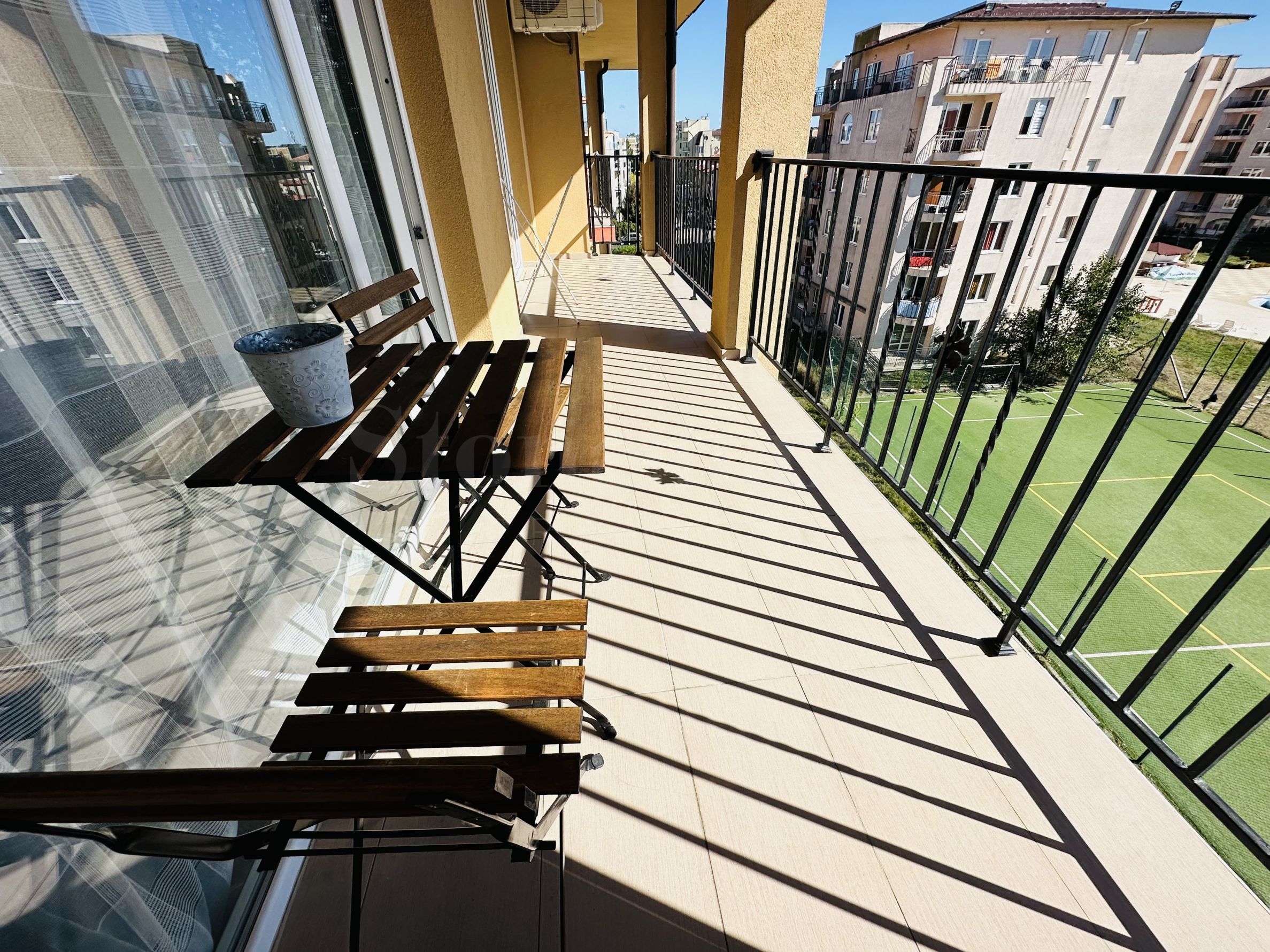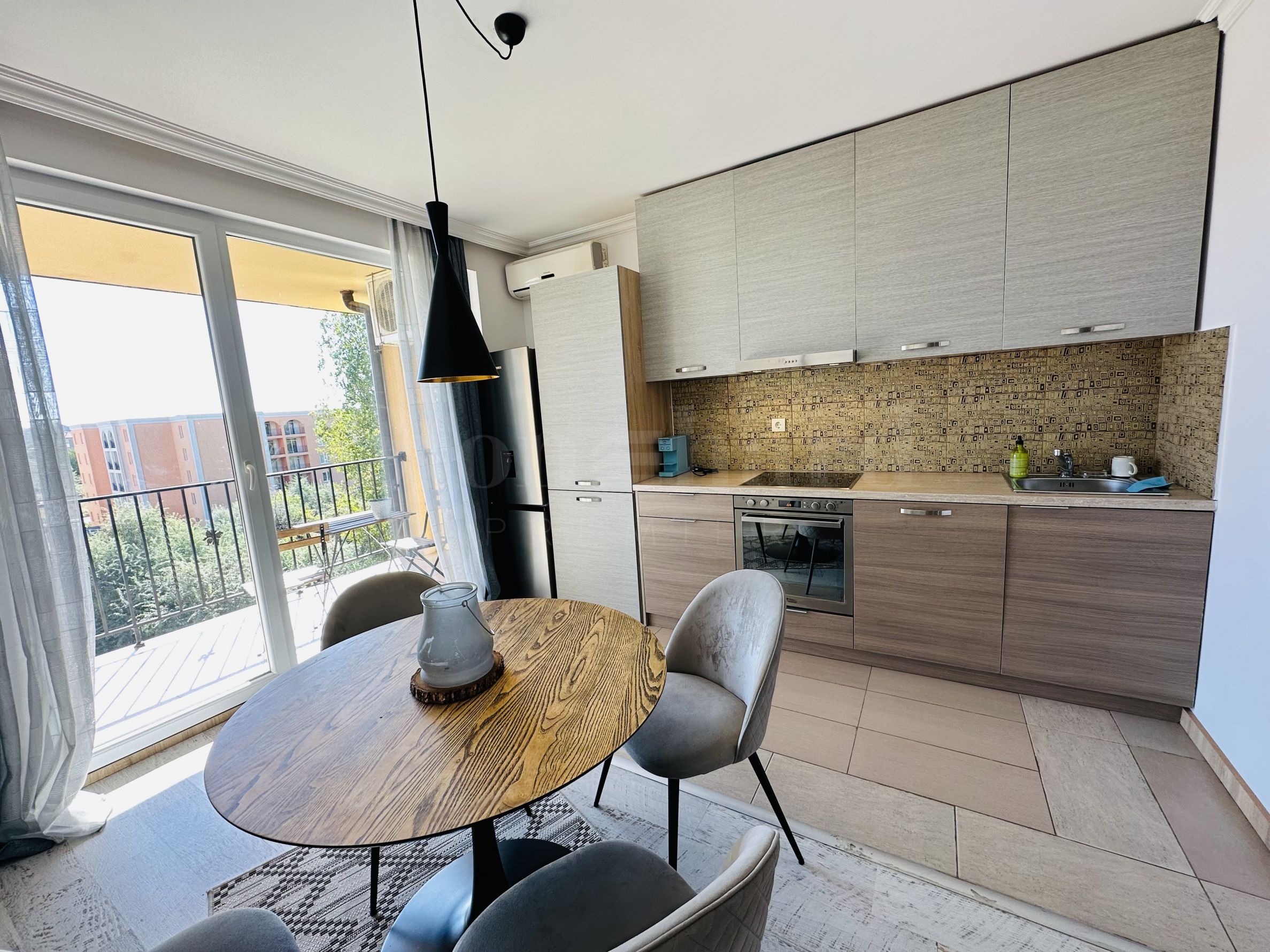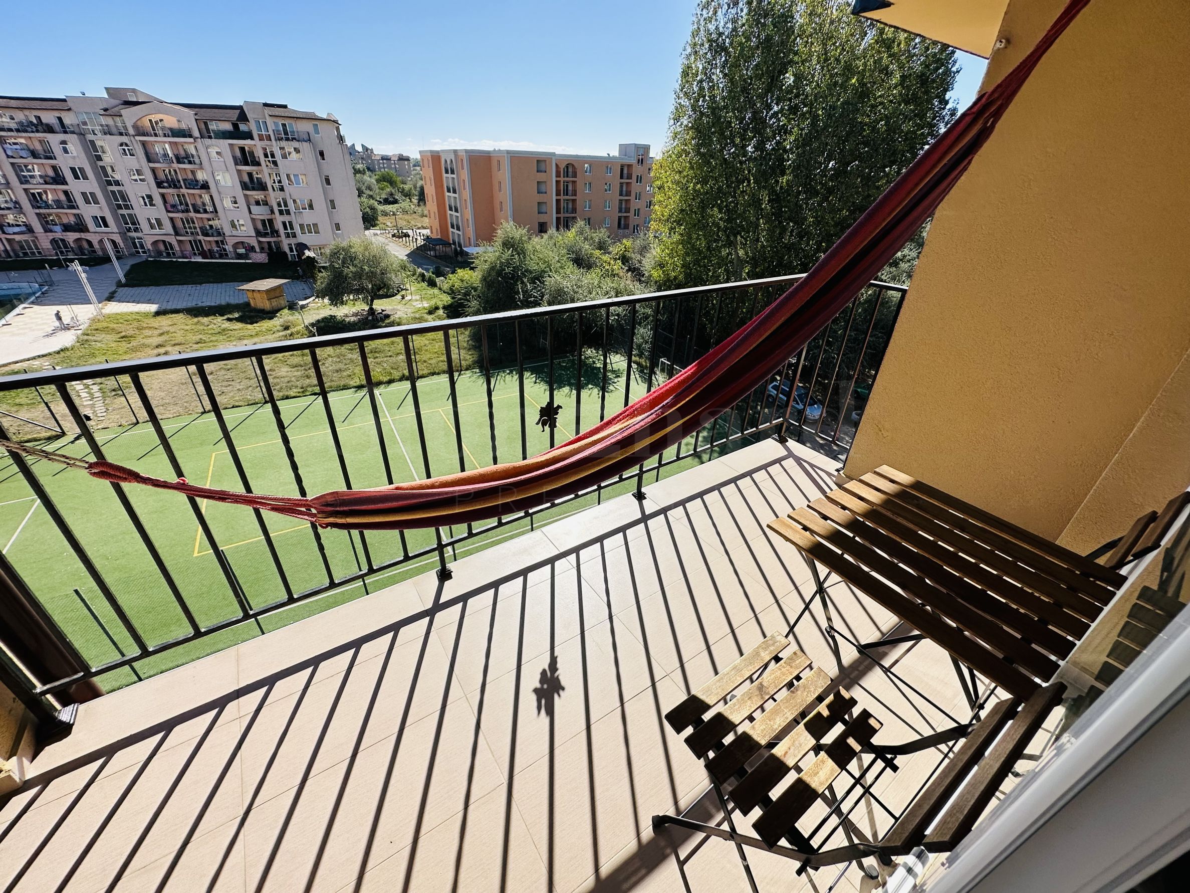 Le complexe est sécurisé par un portail, un contrôle d'accès, une sécurité 24h/24 et une vidéosurveillance, vous garantissant un séjour paisible et en toute autonomie. À proximité se trouvent un arrêt de bus et des commerces de proximité, et à seulement 250 mètres du complexe, une plage paradisiaque bordée de dunes naturelles. Deux plages prisées, « Cacao Beach » et « Bedroom », avec leurs restaurants de renommée internationale à l'ambiance unique, leurs événements exceptionnels et leur cuisine raffinée et inoubliable, sont également à 250 mètres du complexe. L'endroit est idéal pour bronzer, pratiquer divers sports nautiques et profiter de soins spa. La vieille ville de Nessebar, classée au patrimoine mondial de l'UNESCO, est également à proximité.