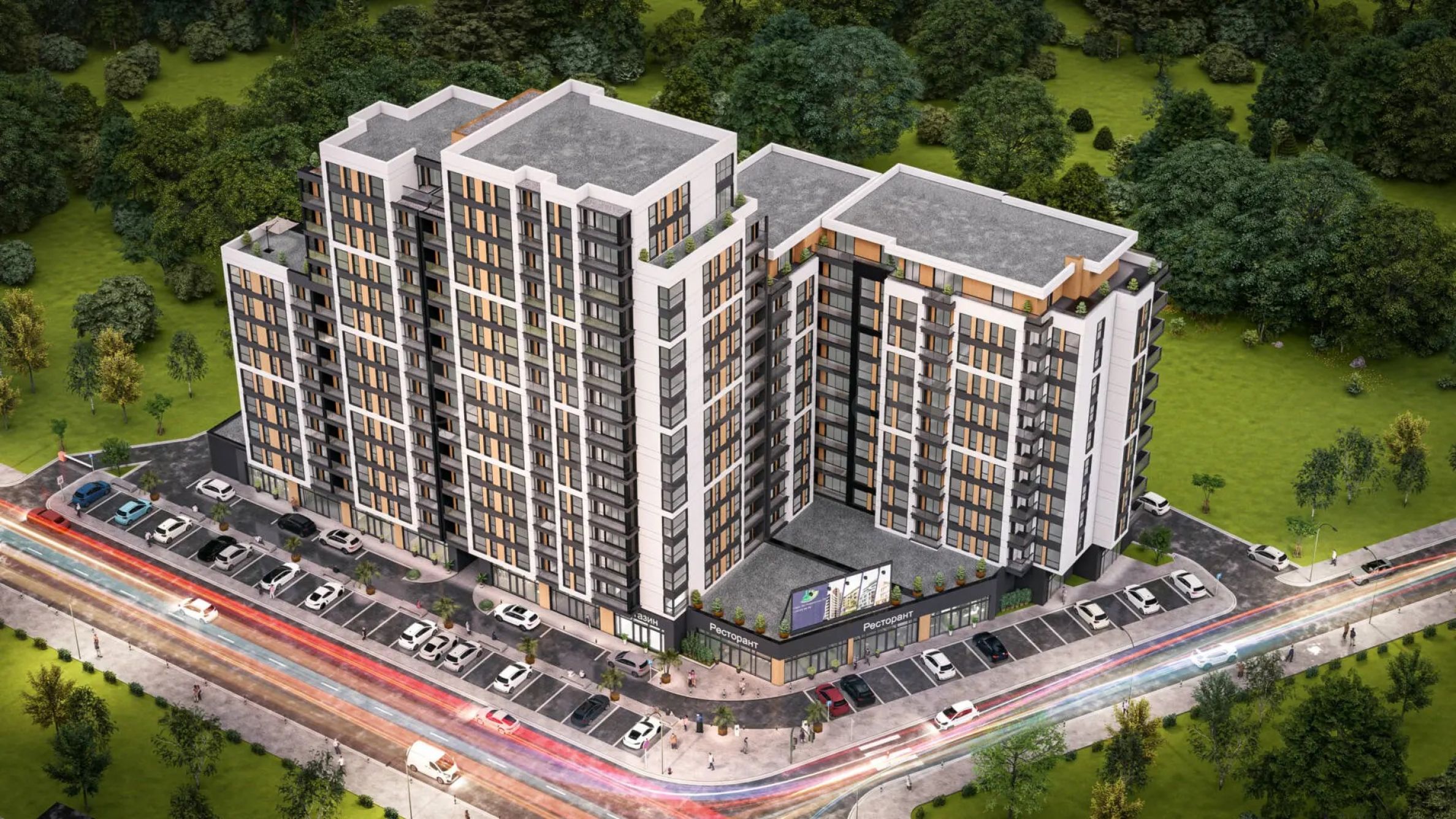 Le complexe comprendra 4 sections, avec un total de 241 appartements, de 3 à 6 studios, appartements de deux et trois pièces par étage. Chaque section aura une entrée individuelle, avec un ascenseur attenant qui assure une liaison chauffée avec le parking souterrain de l'immeuble. Les parties communes seront luxueusement finies avec des matériaux de haute qualité et un design unique. Les logements ont des distributions fonctionnelles, ce qui rend les pièces lumineuses et spacieuses. Au rez-de-chaussée se trouvent des locaux commerciaux et des bureaux.
