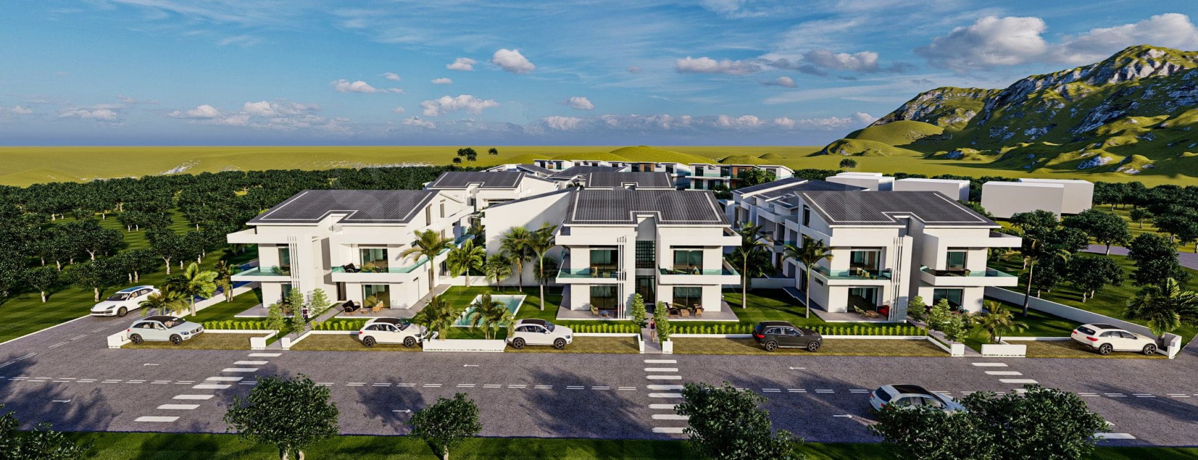 Chaque propriété est méticuleusement conçue dans les moindres détails - les maisons combinent des lignes épurées, des couleurs claires et de grandes fenêtres qui laissent entrer la lumière du jour dans les pièces. L'accent est mis sur le confort maximal, et à cet effet, chaque appartement dispose d'une terrasse où vous pourrez passer du temps le matin avec votre café ou le soir rencontrer des amis. Dans la cour du complexe, en plus d'un aménagement paysager riche, vous trouverez également des piscines extérieures partagées et des espaces de loisirs autour d'elles, qui sont un endroit idéal pour les familles avec enfants.