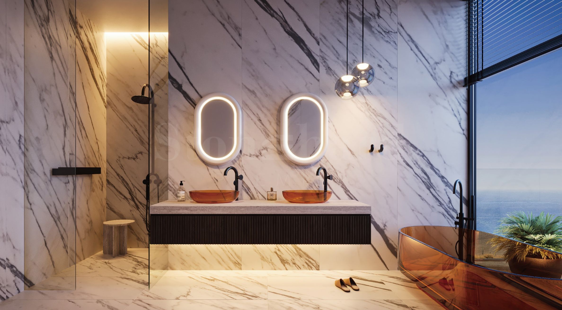Adoptez un style de vie actif tout en profitant du confort moderne et de votre maison confortable. Chaque appartement est conçu avec une attention méticuleuse aux détails, avec des matériaux haut de gamme et un intérieur moderne et élégant. Les appartements disposent d'espaces de vie spacieux et de grandes baies vitrées, de balcons avec vue imprenable sur le golfe Persique, de cuisines luxueuses avec des appareils Smeg de pointe, complétés par des comptoirs en pierre durables et élégants. Les chambres élégantes sont équipées d'armoires encastrées avec portes vitrées et d'un éclairage intérieur intégré, tandis que les salles de bains impressionnent par leur marbre italien Calacatta Viola et leurs sanitaires Tom Dixon. Les revêtements de sol et carrelages de haute qualité sont complétés par des solutions d'éclairage sophistiquées de Zonda Lighting, et les interrupteurs et prises Siemens ajoutent une touche de fonctionnalité et de style contemporains. La conception des maisons a été réalisée par des noms célèbres du secteur, parmi lesquels Antonio Lupi, Lalique, Tom Dixon et Antonio Citterio.