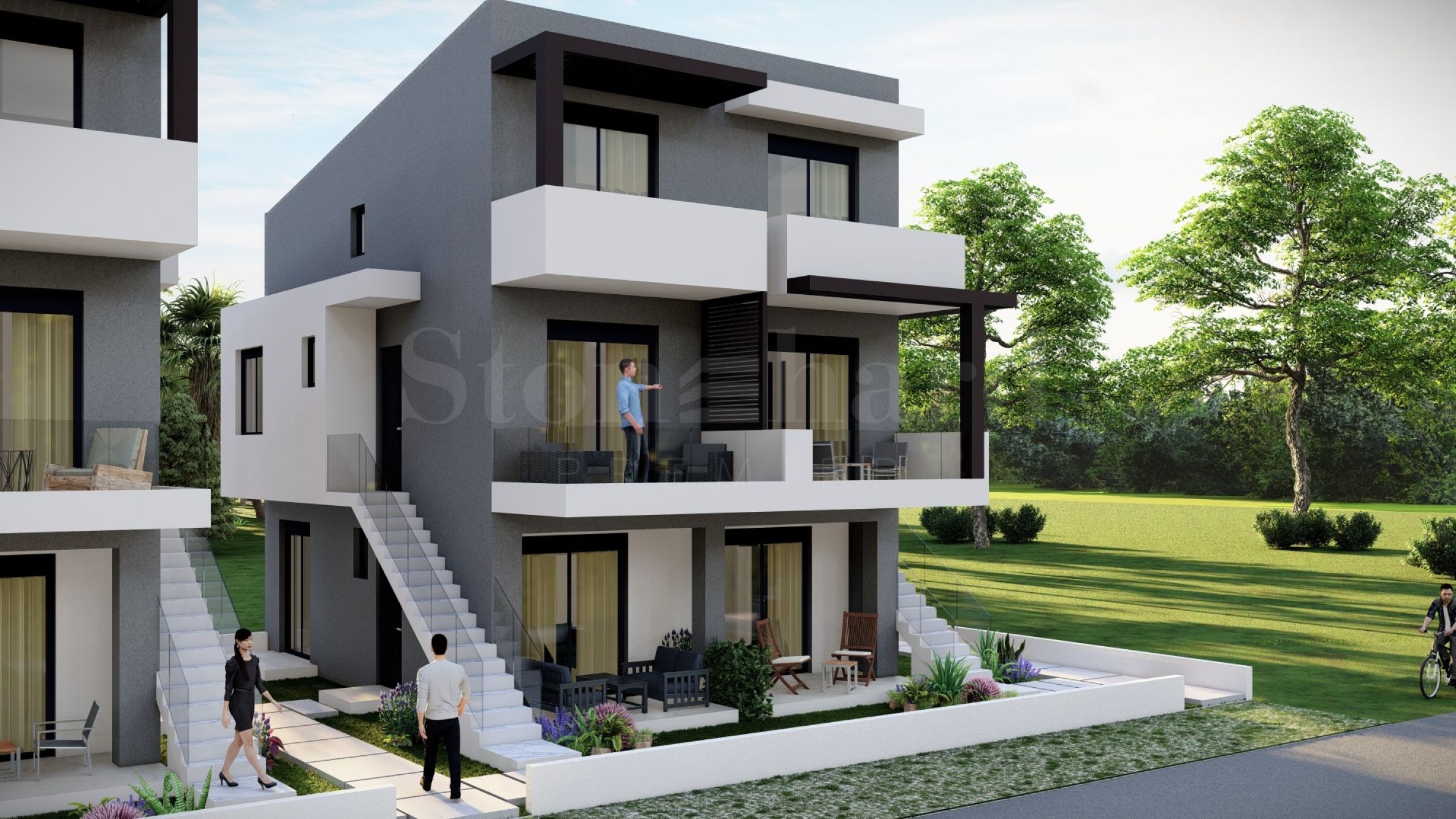 Le complexe se compose de deux bâtiments avec un total de 16 appartements au design moderne et aux solutions architecturales fonctionnelles. Les appartements disponibles varient en taille de 55,22 m² à 60,44 m² et sont accessibles par un escalier extérieur individuel pour chaque appartement.