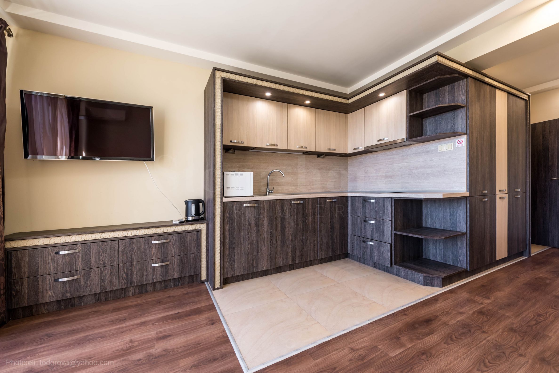 grand salon avec coin cuisine ;
