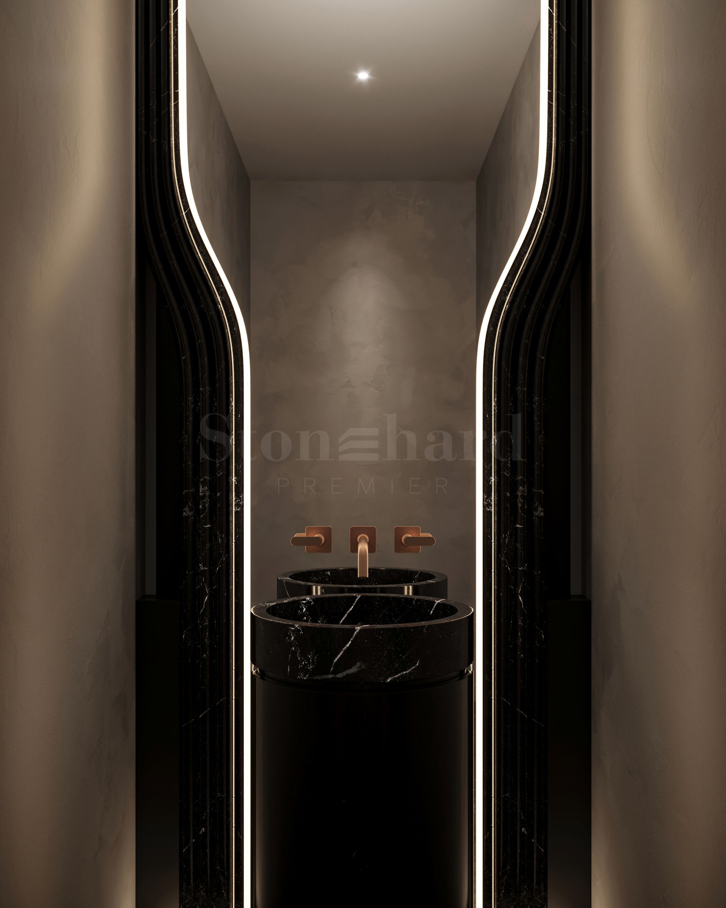 Douche en pierre noire ou blanche avec système de douche à effet pluie entièrement intégré et niche éclairée ;