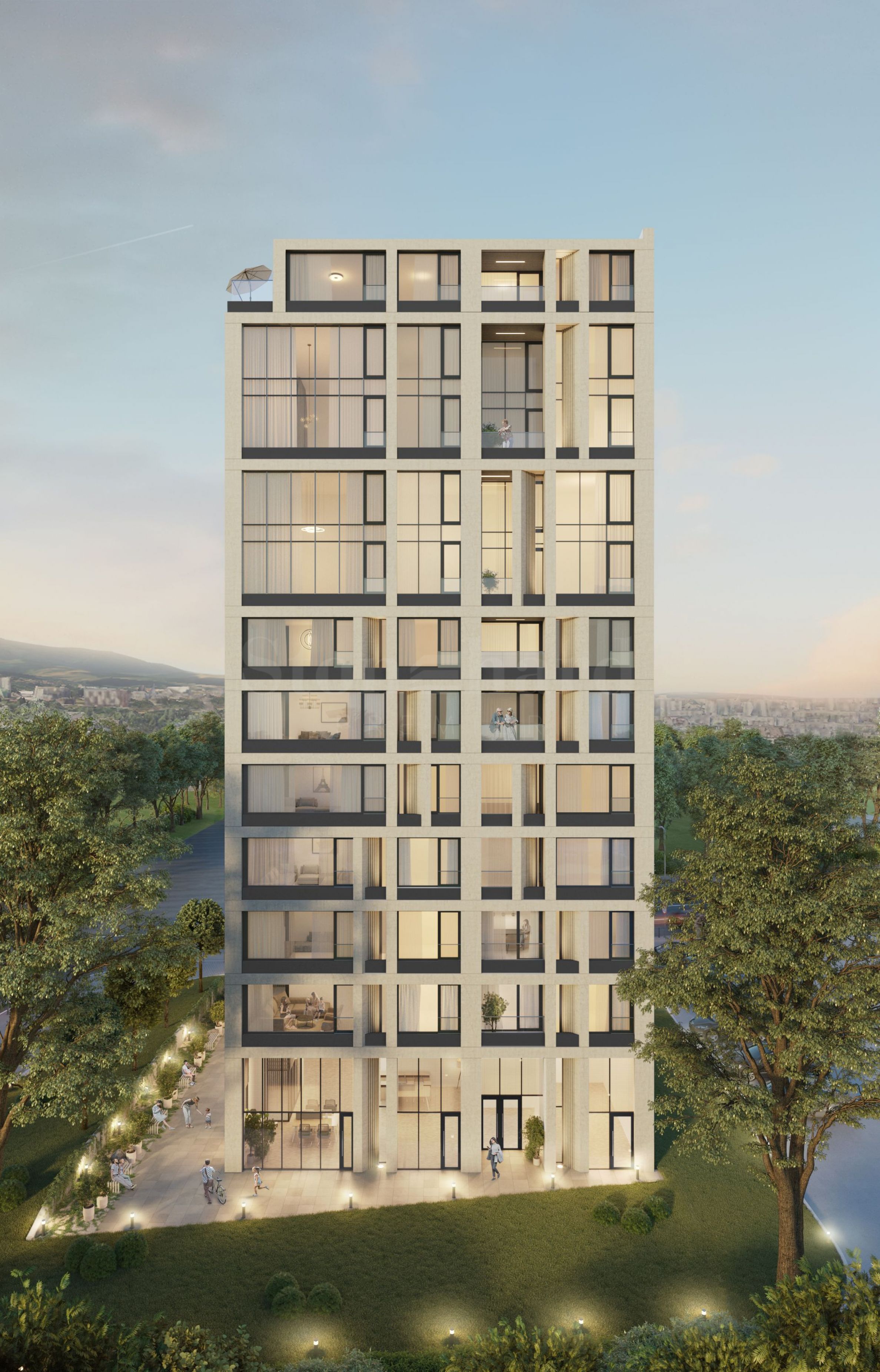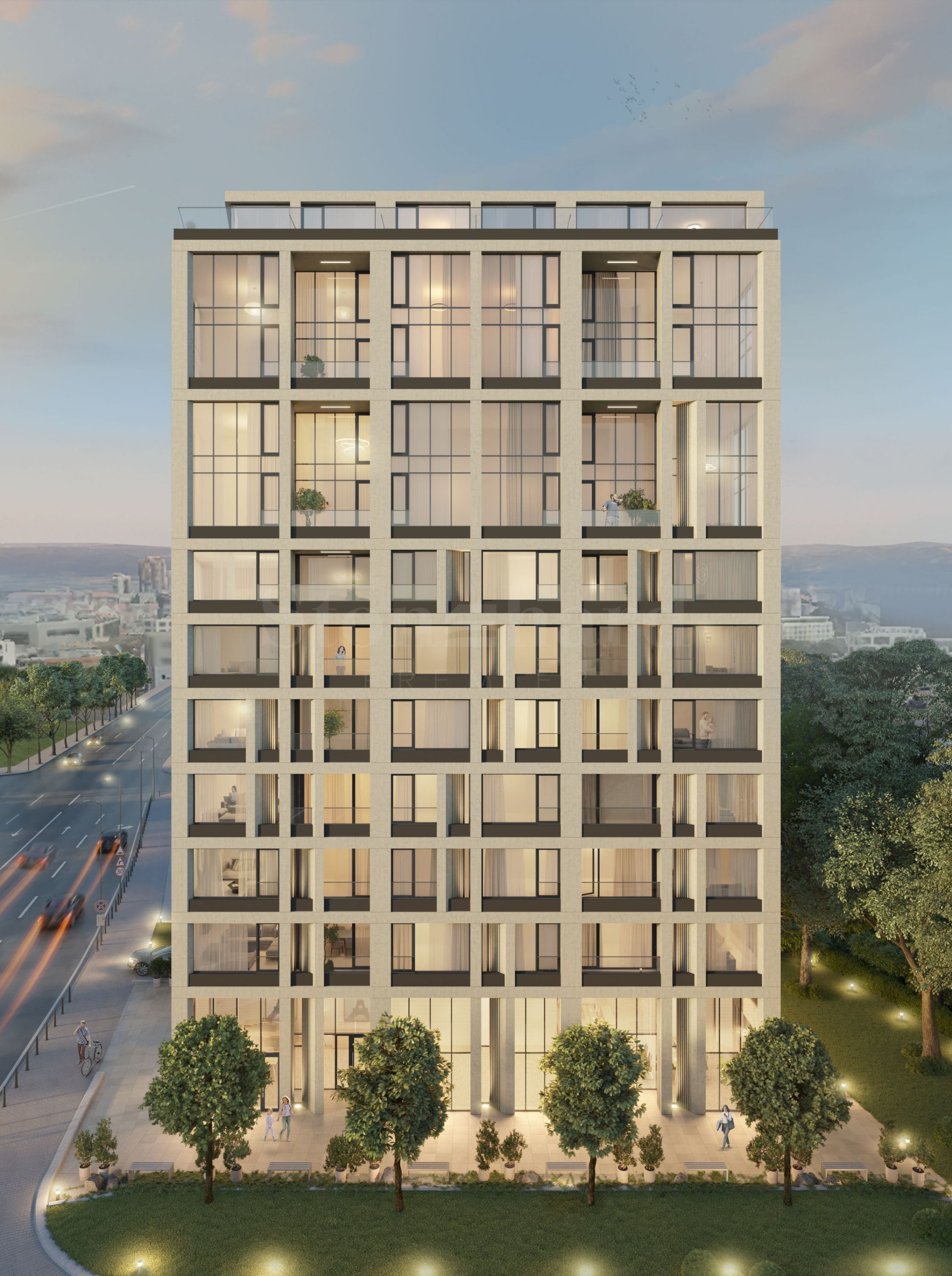 L'architecture du bâtiment est impressionnante, contemporaine et fonctionnelle, avec des lignes épurées et des espaces intérieurs ouverts. Les logements se distinguent par de très hauts plafonds, atteignant jusqu'à 6 mètres, et les portes-fenêtres à seuil bas et vitrage sans cadre créent une sensation d'espace, de lumière et de connexion avec l'environnement, avec vue sur le mont Vitosha et les lumières de la ville.