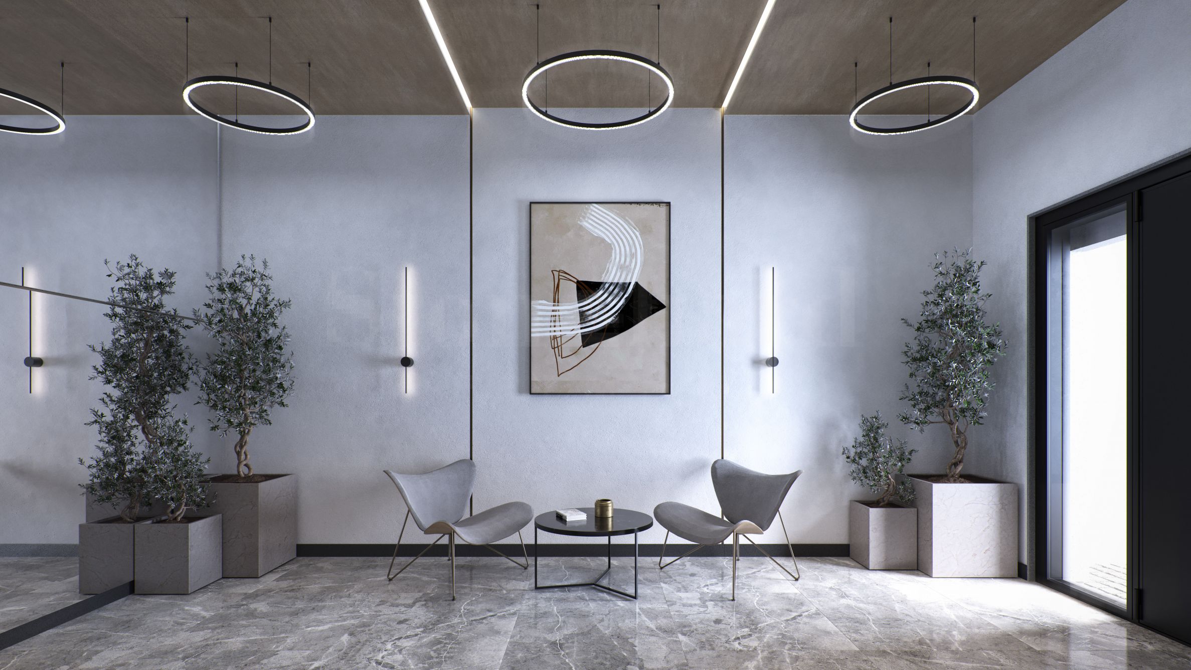 Le sol des parties communes de l'immeuble, du hall, des couloirs et des escaliers, sera recouvert de dalles de pierre naturelle (granit poli). Les rampes d'escalier sont en aluminium ajouré, un détail architectural visible sur les visualisations 3D intérieures du bâtiment. Les paliers seront équipés de portes vitrées anti-fumée à fermeture automatique. Pour le revêtement des balcons et loggias, nous avons choisi du carrelage en granit italien antidérapant. Les terrasses ouvertes bénéficieront d'un double plancher et d'un sol en carrelage céramique italien.