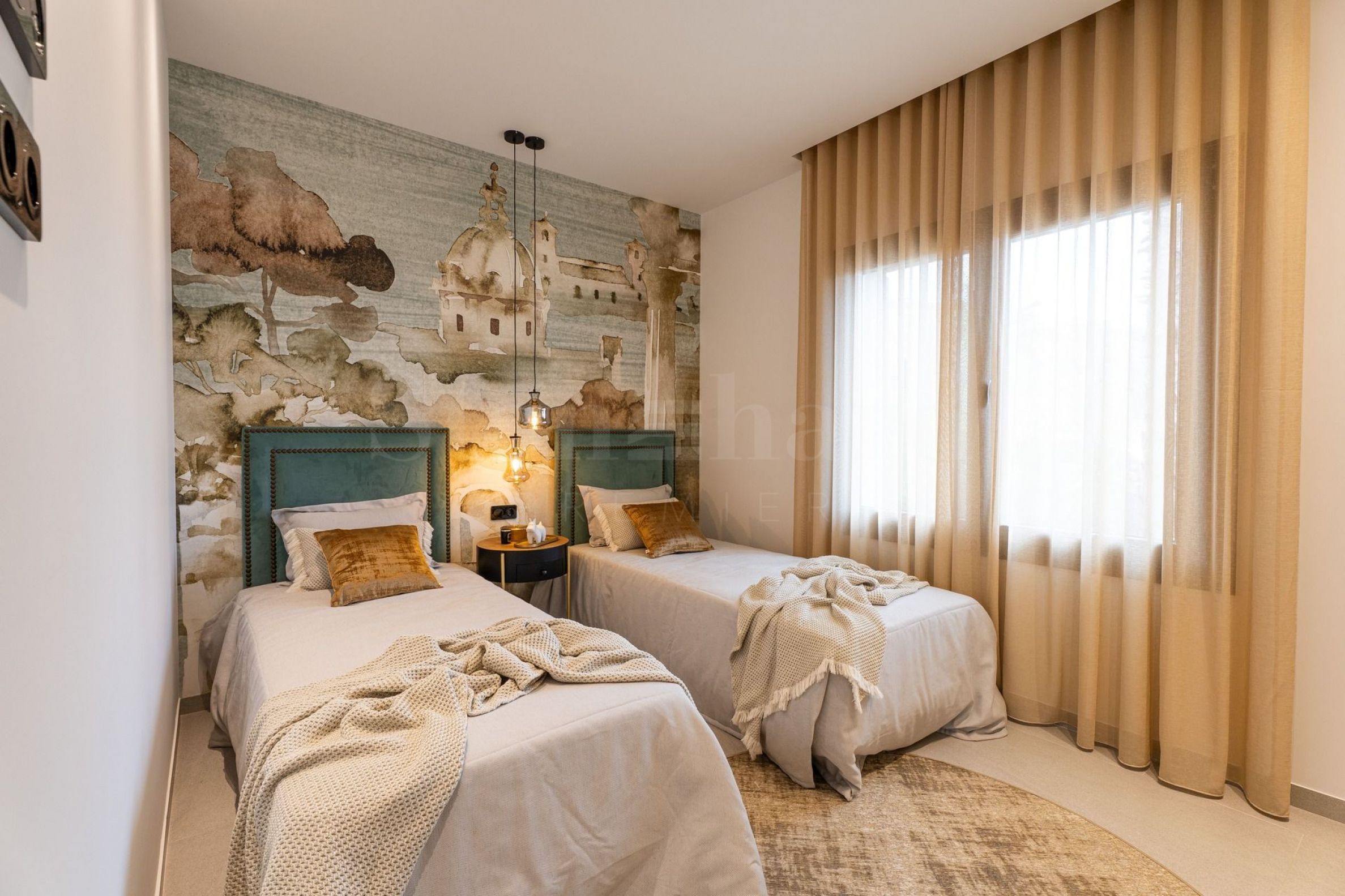 Les propriétés sont proposées « clés en main » : portes d'entrée et intérieures installées, revêtements de sol, menuiseries PVC, cuisines entièrement équipées et salles de bains équipées. Les cuisines sont blanches avec des plans de travail en bois clair : une base élégante et neutre qui permet d'apporter une touche personnelle à l'intérieur. Les salles de bains sont conçues comme un véritable spa, avec des espaces douche séparés visuellement par des cloisons en verre, du carrelage en relief et d'élégants lavabos, qui complètent l'impression de sophistication.