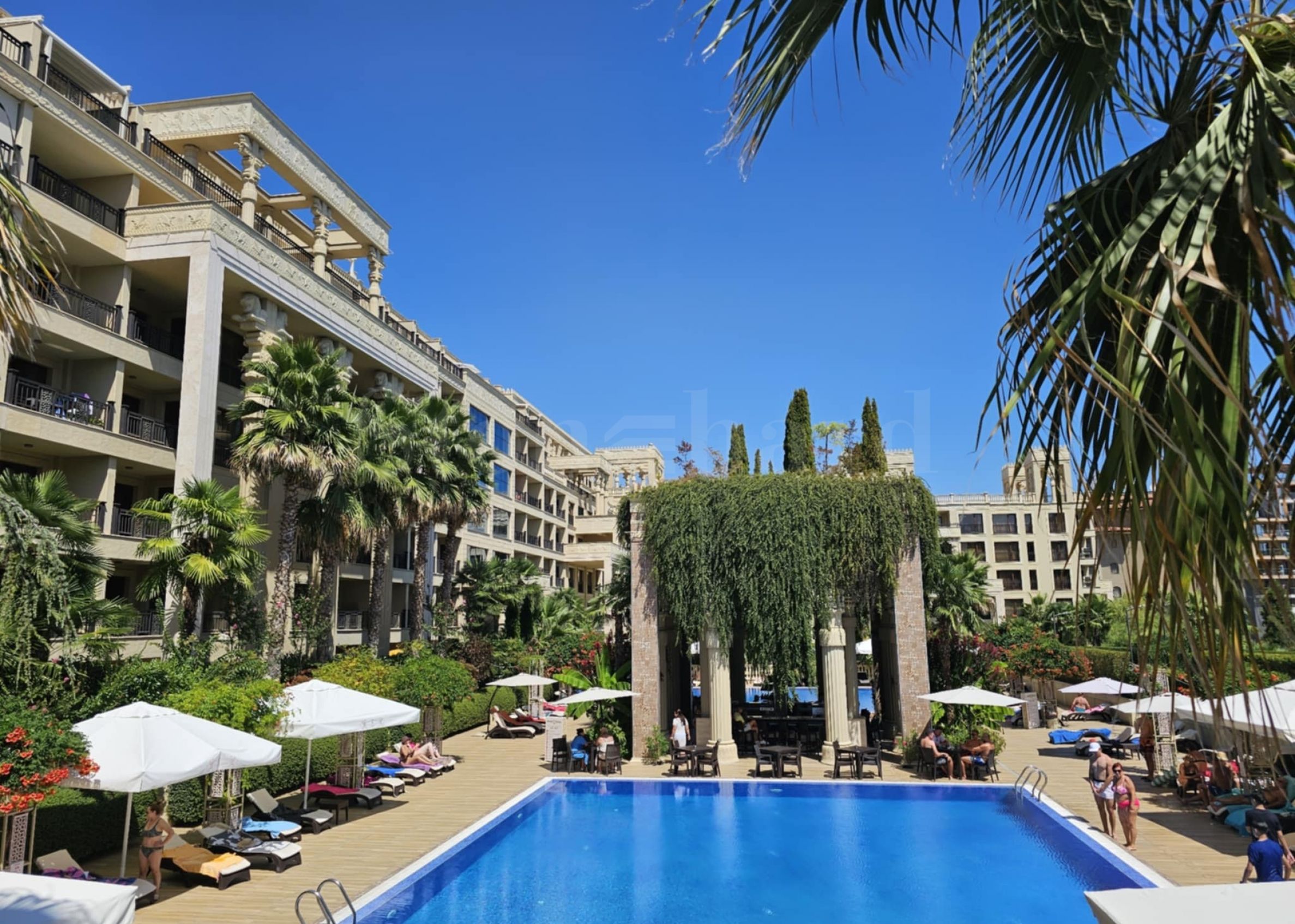 Le complexe est construit dans un style unique, richement décoré avec des ornements et des statues sur les façades et les colonnes. C'est l'un des appartements-hôtels les plus récents et luxueusement réalisés dans la station balnéaire de Zlatni Piasatsi. Pour les résidents de l'immeuble, il y a quatre piscines extérieures, une salle de sport, un restaurant, un bar, un parking souterrain et aérien, une aire de jeux pour enfants, ainsi qu'un vaste territoire bien paysagé et entretenu.