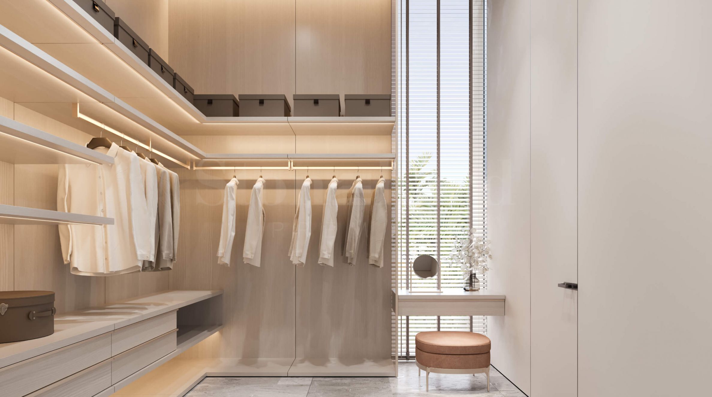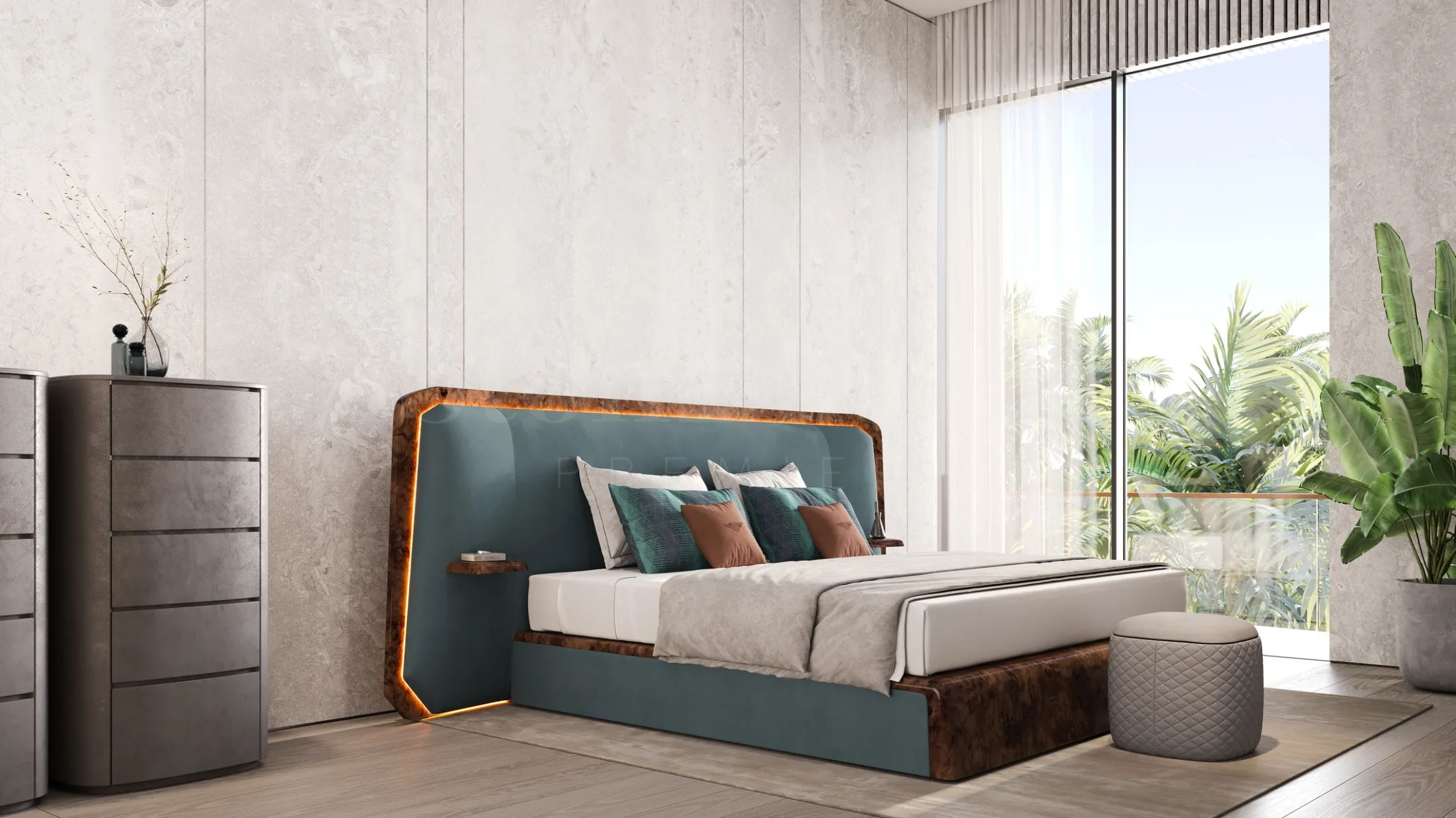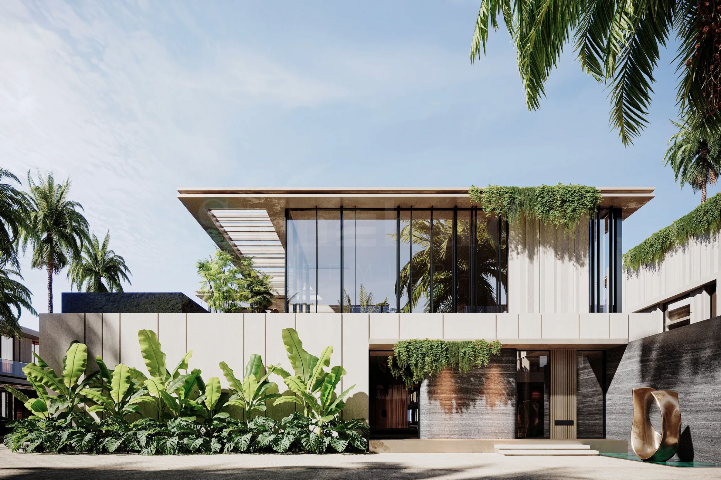 Les villas sont réparties sur quatre étages et offrent un agencement comprenant de vastes séjours, deux cuisines (l'une ouverte sur le séjour, l'autre fermée), cinq chambres avec salles de bains et dressings privatifs, ainsi que de grandes terrasses. Au troisième étage, un logement pour le personnel avec salle de bains, une buanderie et des espaces de rangement sont aménagés. Sur le toit, une magnifique terrasse avec espaces de détente et de loisirs est prévue, qui deviendra sans aucun doute un lieu de prédilection pour se reposer et profiter des soirées en plein air. Chaque villa dispose d'un jardin paysager agrémenté d'une piscine de 9 x 3 m.