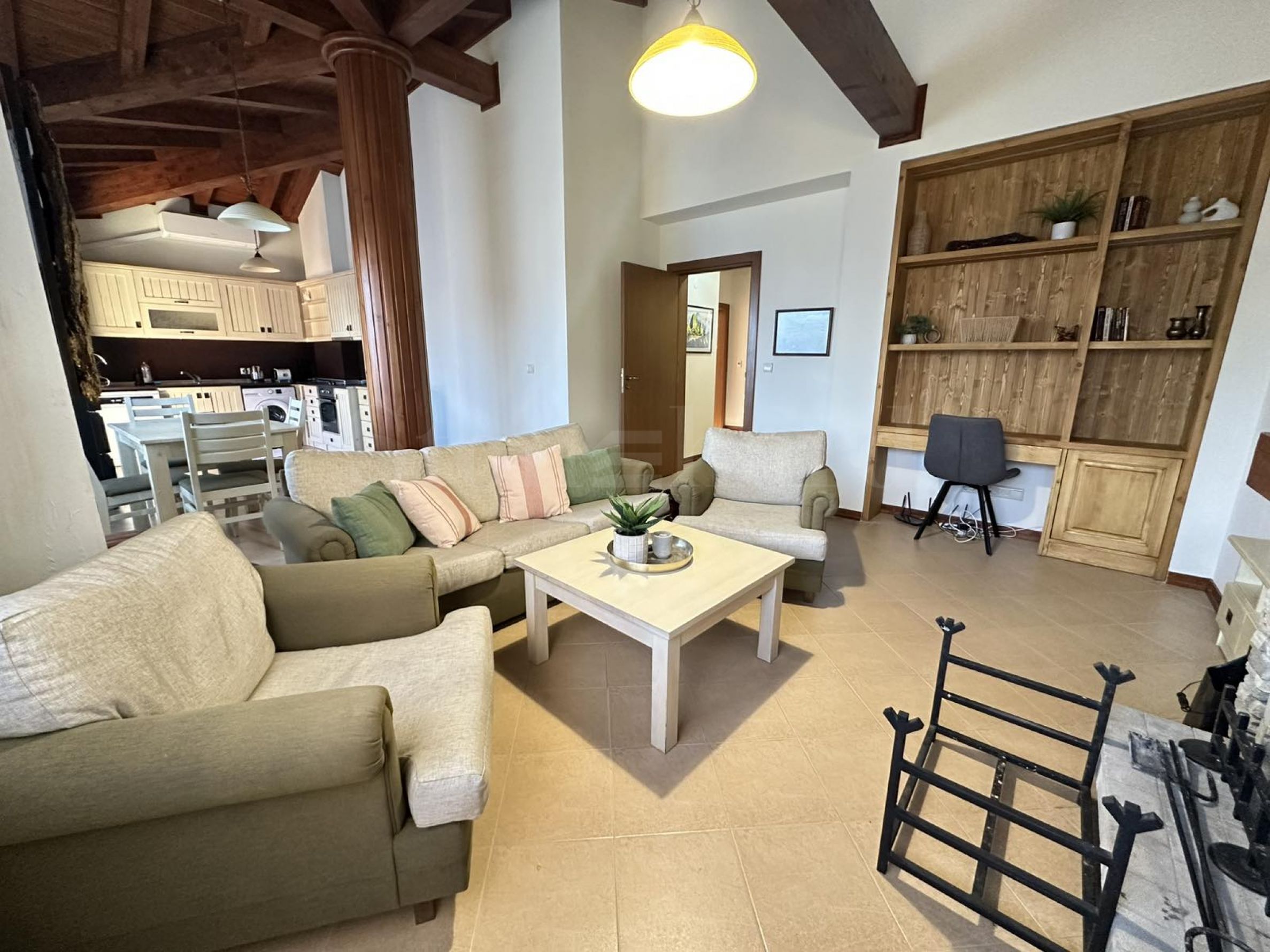 • Salon avec deux canapés, table basse, télévision, table à manger, 4 chaises, cheminée et balcon avec une belle vue panoramique ;