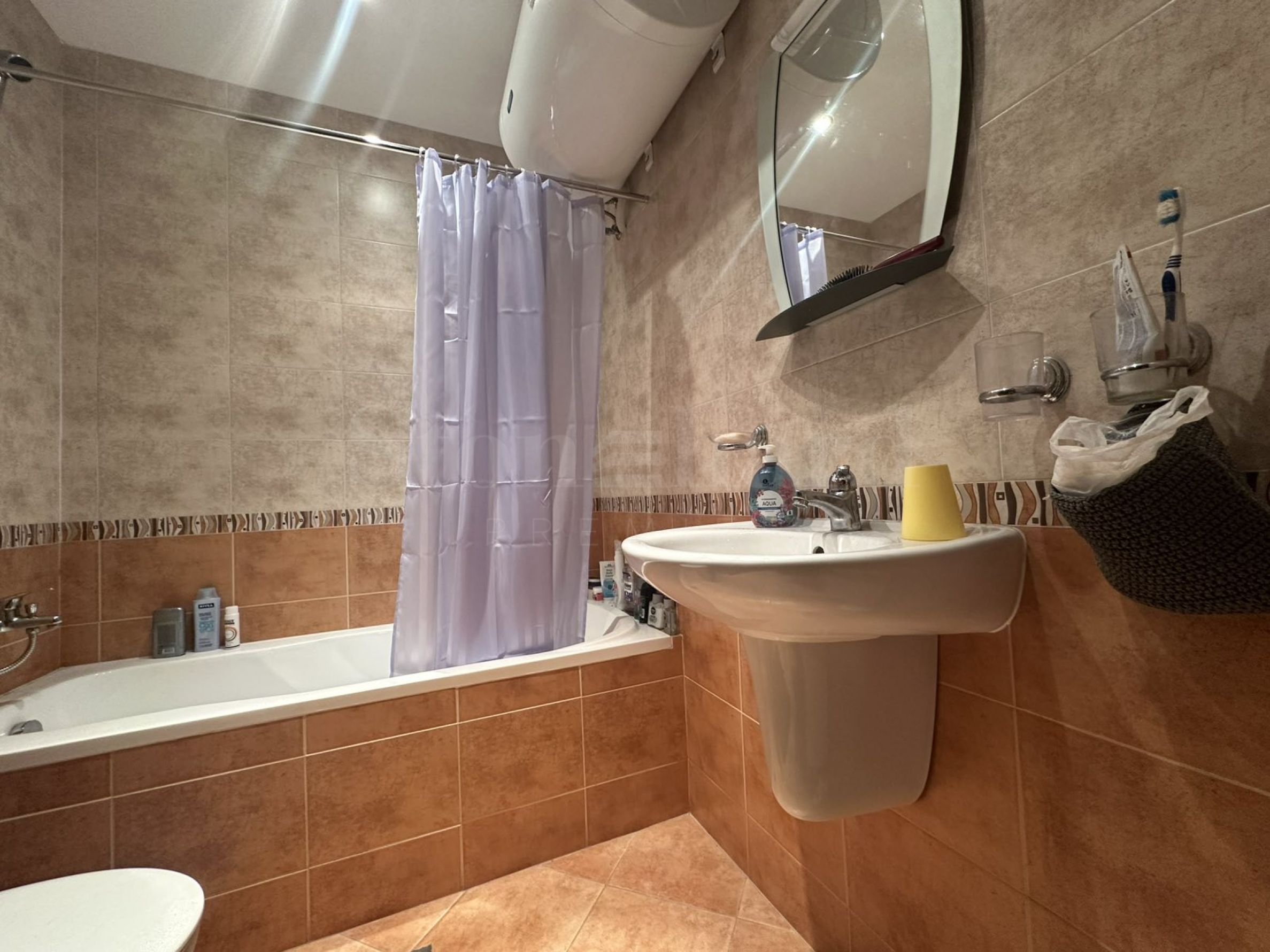 • Salle de bain avec baignoire et toilettes ;