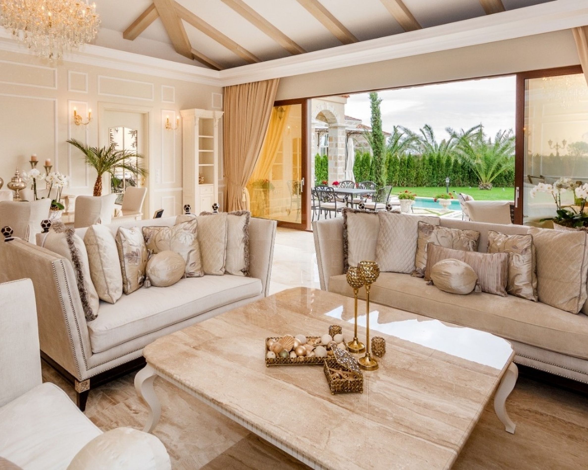 • piscine centrale revêtue de marbre naturel Pyrgos Light ;