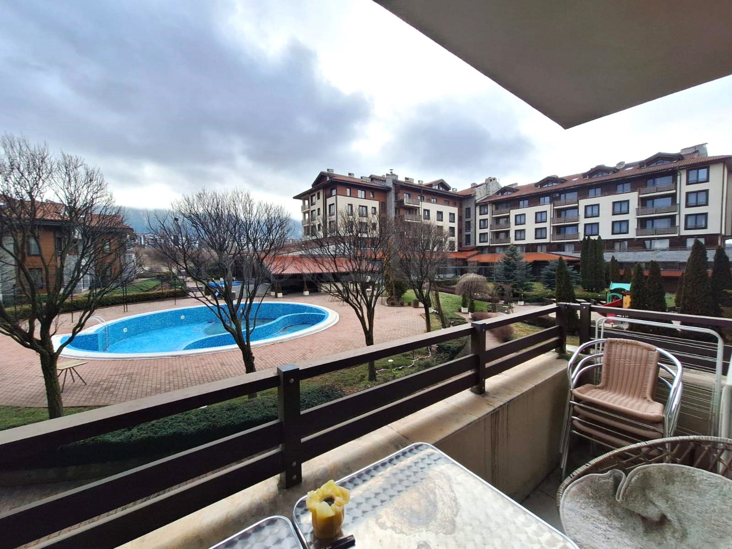 La propriété est située dans la région « Bayova borika », avec une vue depuis le balcon sur le Pirin et la piscine extérieure du complexe.
