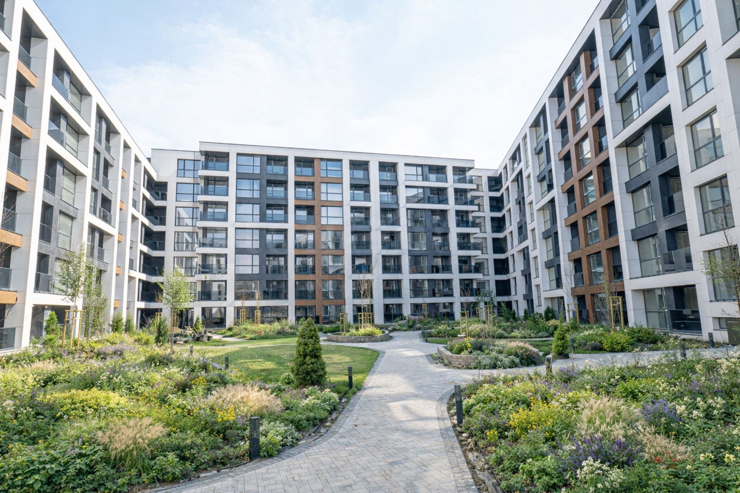 Le complexe comprend une cour intérieure richement végétalisée de 4,3 hectares avec une allée, des aires de jeux pour enfants, des fontaines et une zone barbecue, ainsi qu'un contrôle d'accès, une sécurité et une vidéosurveillance.