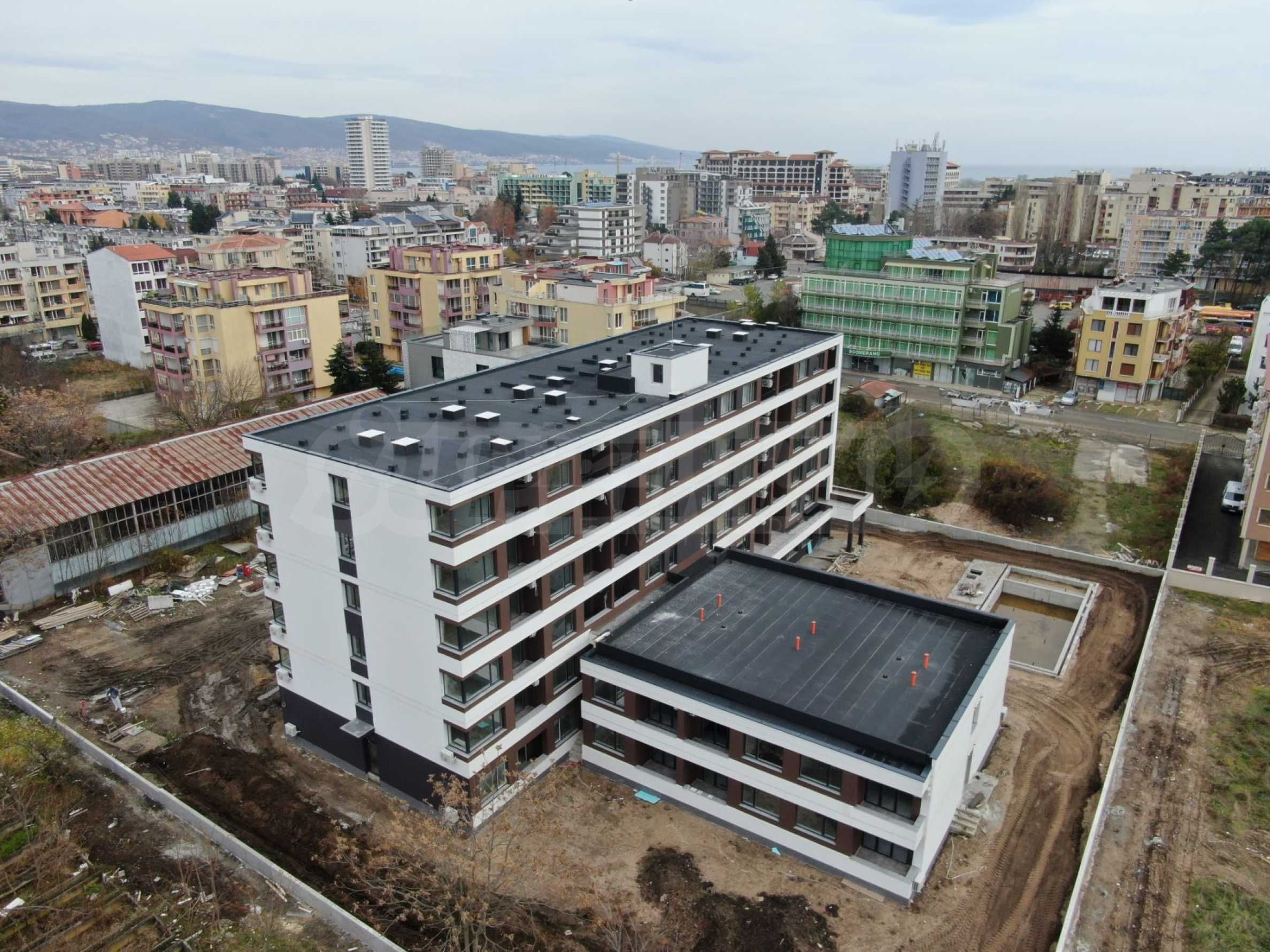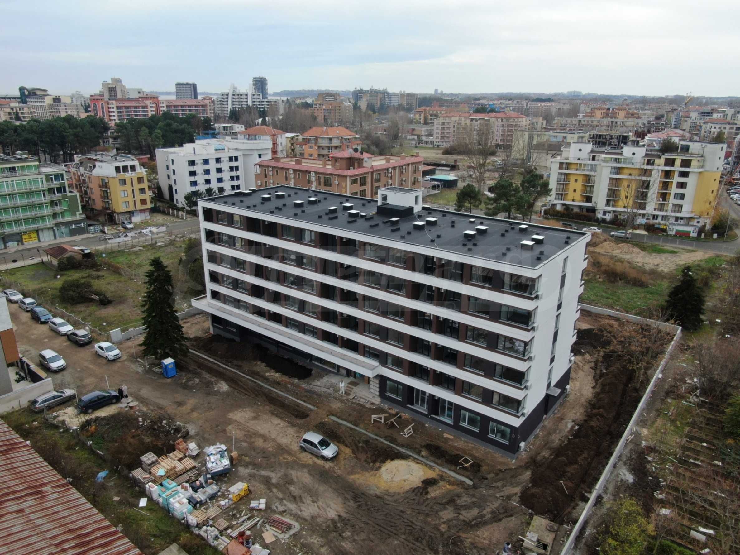 The apart-hotel has a built-up area of 4775.02 m2. It consists of two buildings positioned in close proximity to each other. One is smaller, on 2 floors, and the larger one is spread over 6 levels. There are a total of 82 properties, of which 2 studios, 12 three-room and 68 two-room apartments. On the territory of the complex there will be landscaped common areas, a swimming pool, also suitable for children, a children's corner, a lobby bar that will offer light snacks and a parking lot for the owners with a total of 50 parking spaces. The complex will have 24/7 video surveillance, security and reception.