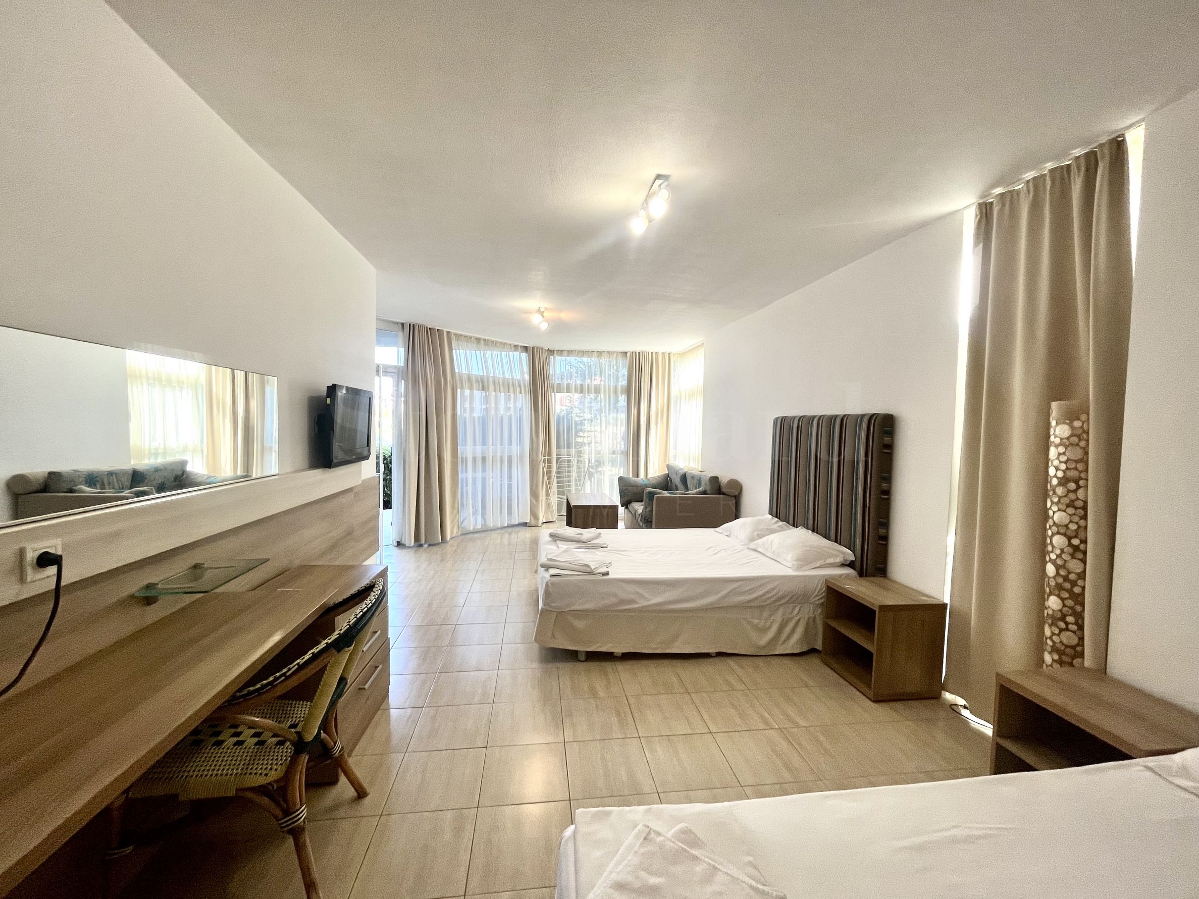 The property is part of a complex with amenities, a three-star modern resort with a lobby bar and restaurant, swimming pool, children's pool and playground, garden, etc. The maintenance fee for the apartment is 10.80 euros per square meter per year.