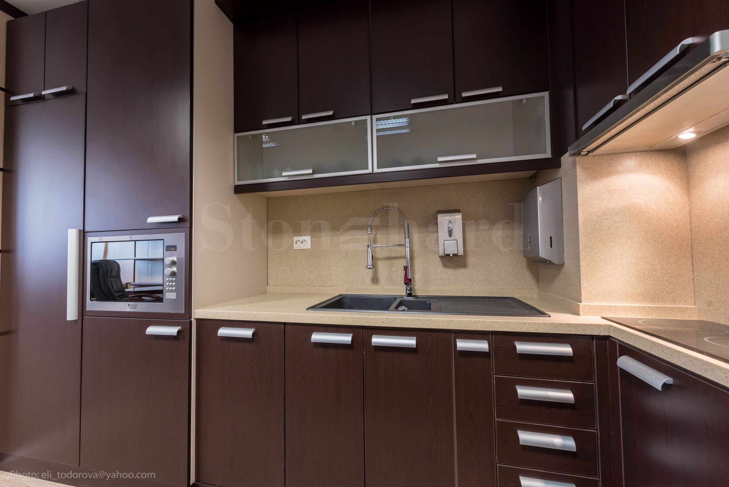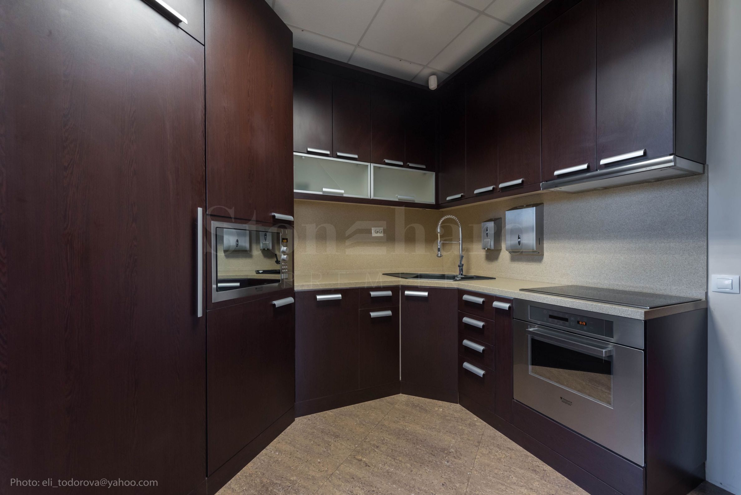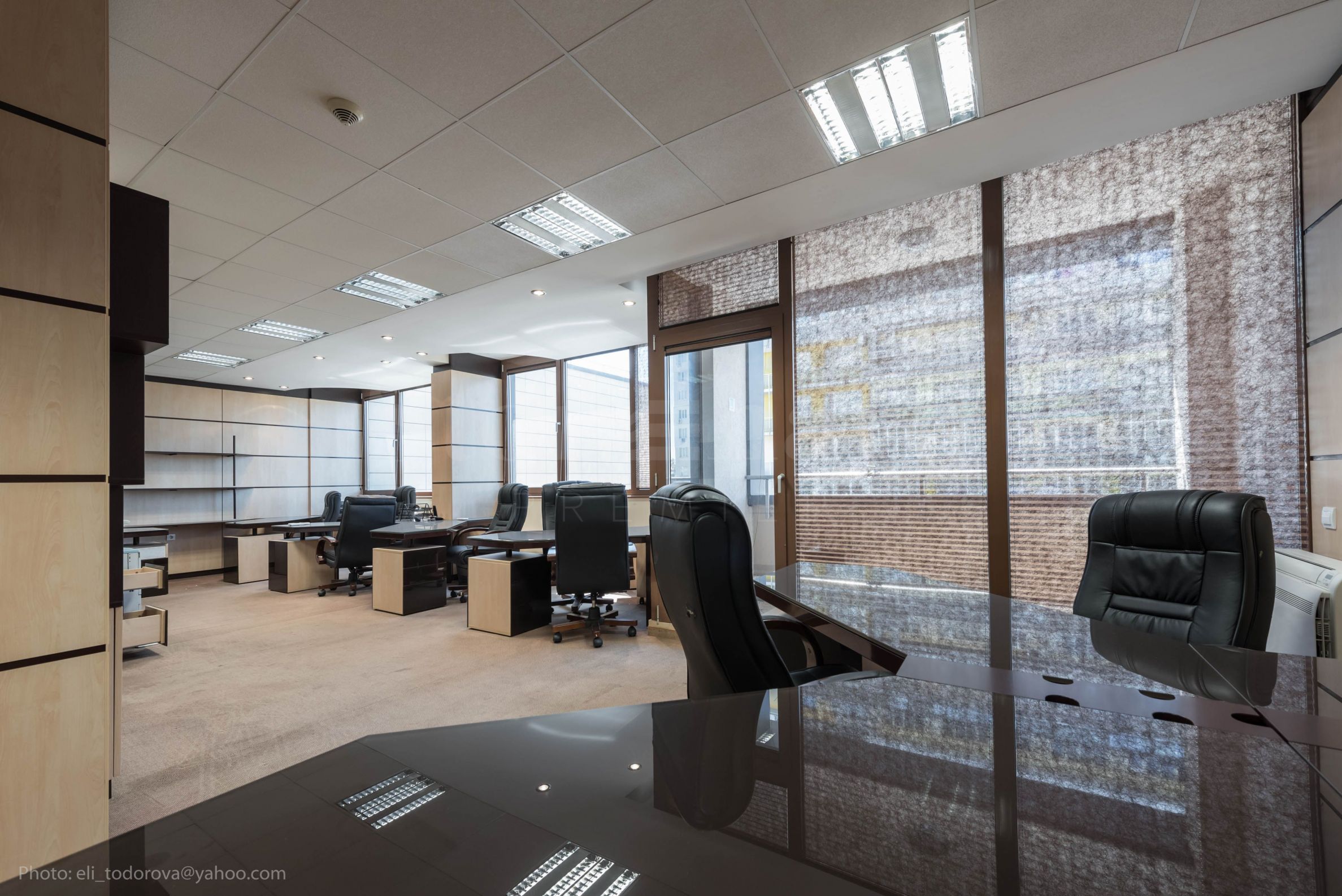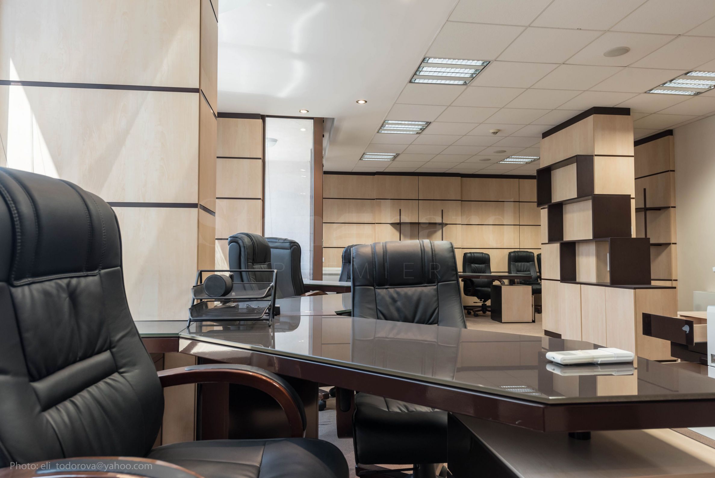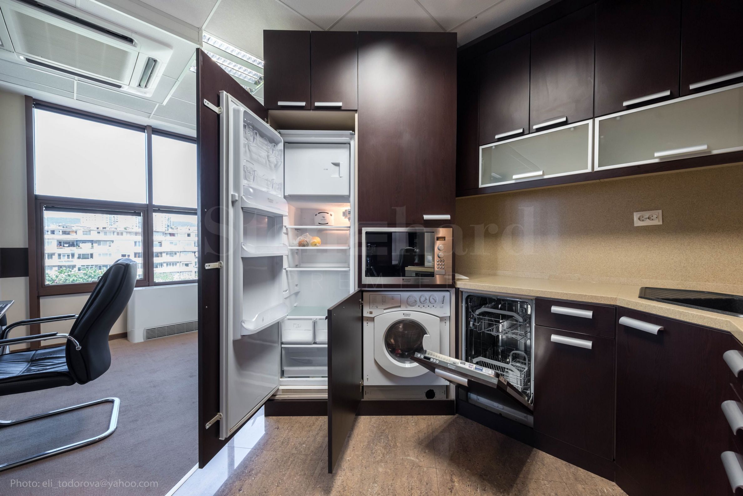 built-in kitchen furniture - microwave oven, refrigerator, stove, hotplates, hood, dishwasher, washing machine. Workroom 2 - 104 m2: with 7 pcs. workplaces with adjacent work furniture: