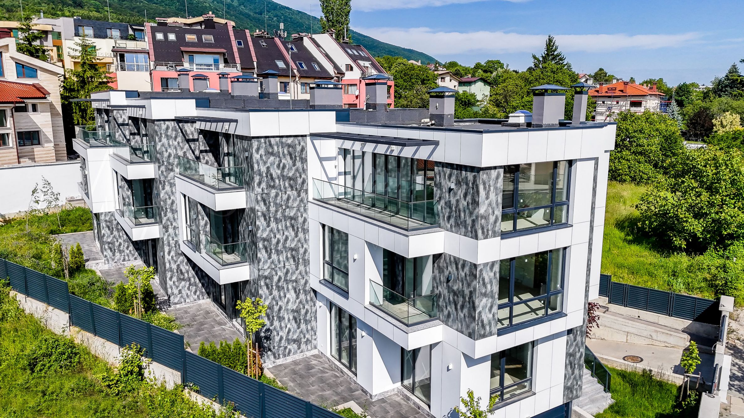The complex is organized in four buildings designed as a row development, with a modern architectural vision and high-class materials and techniques used in the construction. Each house consists of three above ground levels and one basement level with a double garage with individual garage door and storage space. The houses have functional and spacious rooms with French windows that provide plenty of natural light and views of Vitosha. They also have a veranda and access is controlled to ensure comfort and security.