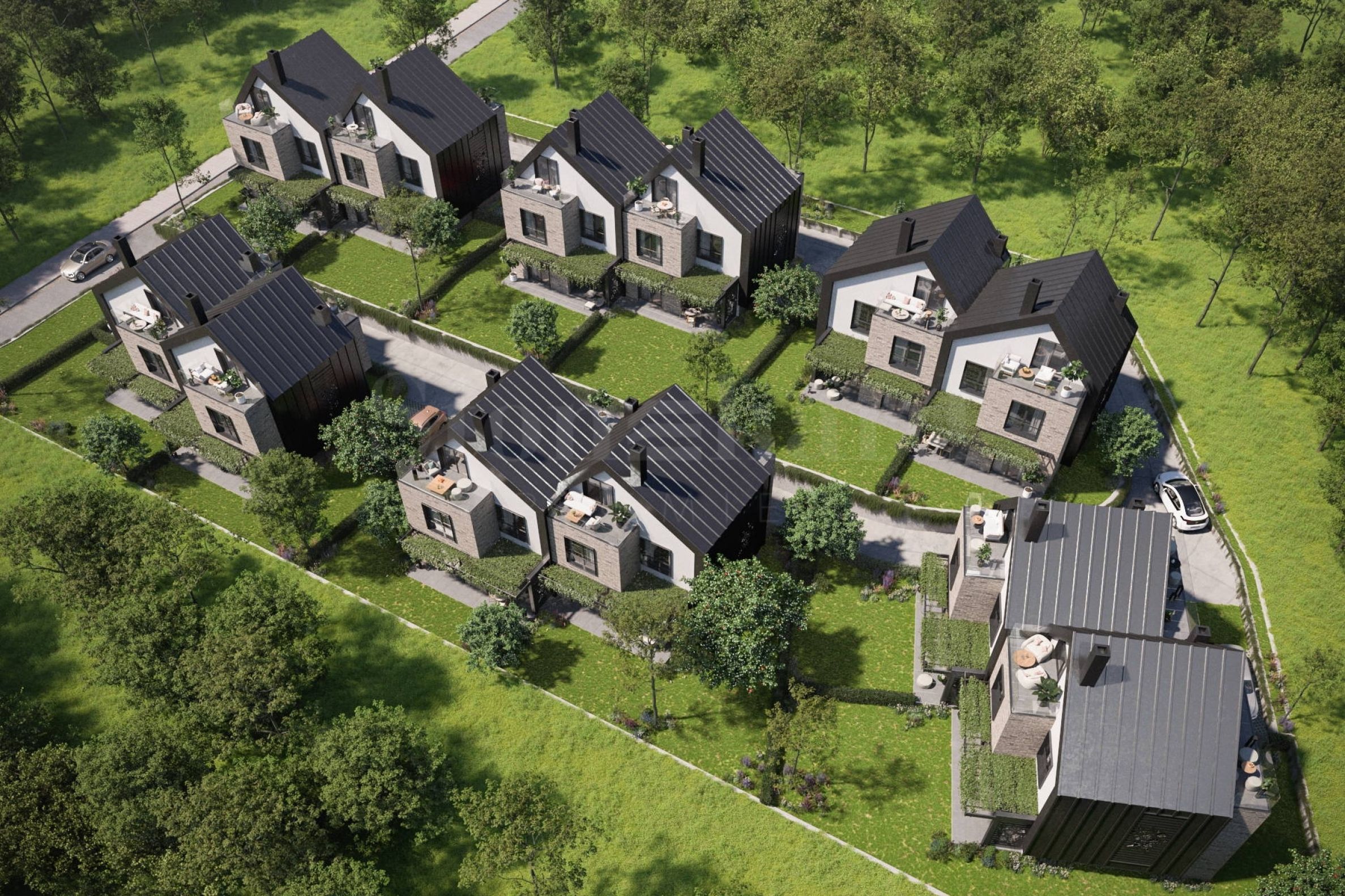 It consists of 12 semi-detached single-family houses, grouped into six elegant Alpine-style residential buildings, with a total built-up area of 2,506 sq m. It has its own spacious green yard and a completely new infrastructure, as well as a completely new, private asphalt road.