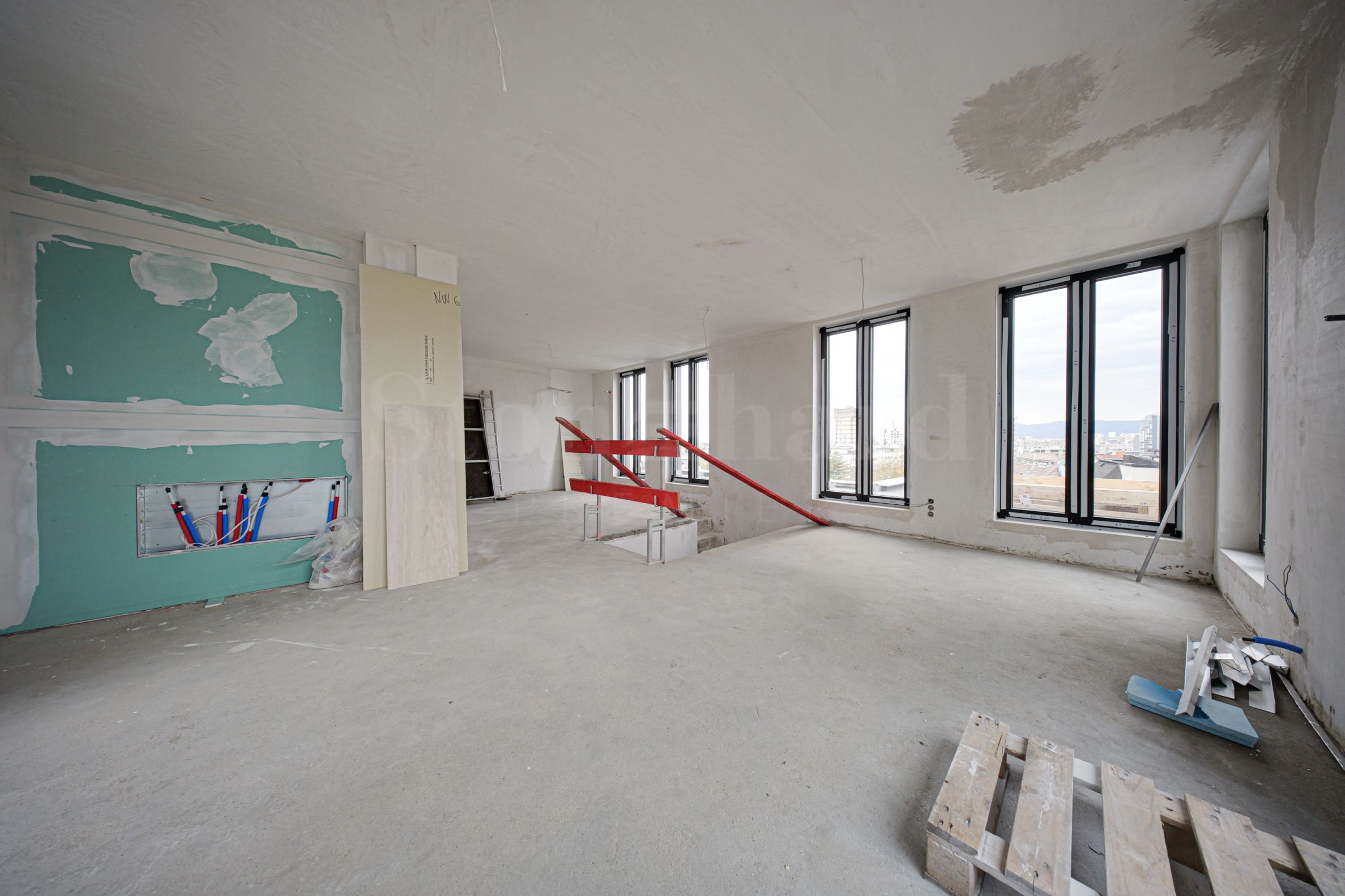 Walls – gypsum plaster; sanitary facilities – exposed concrete;