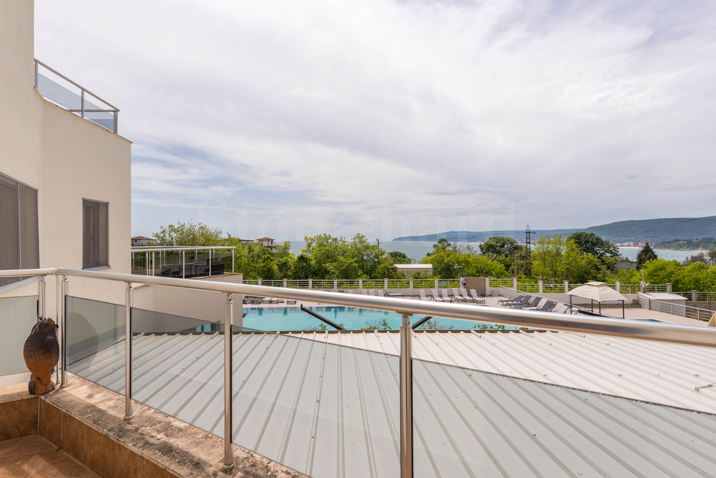 large terrace with a place to relax and a beautiful view of the sea and the pool. Amenities on the territory: