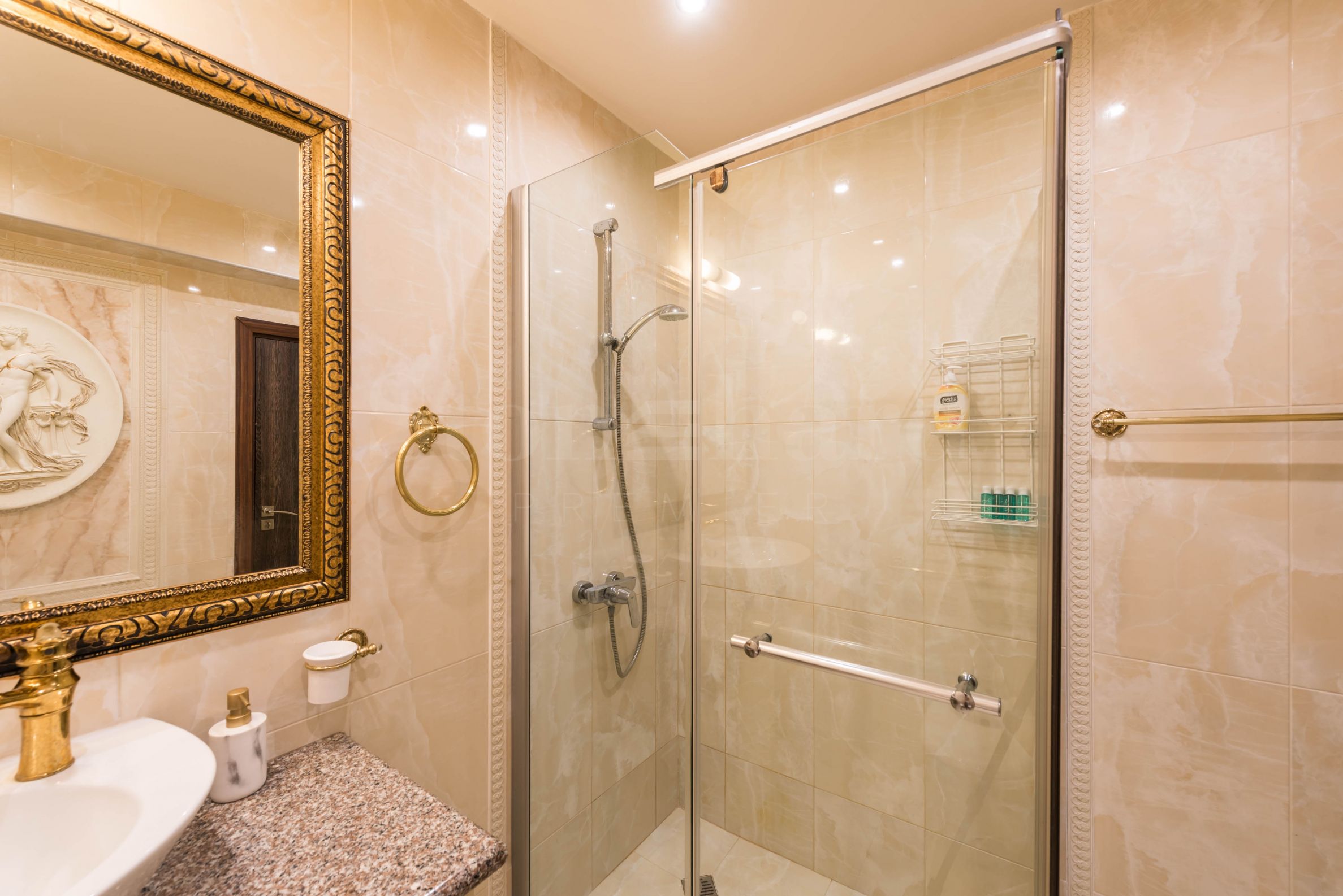 • bathroom with toilet and shower cabin;