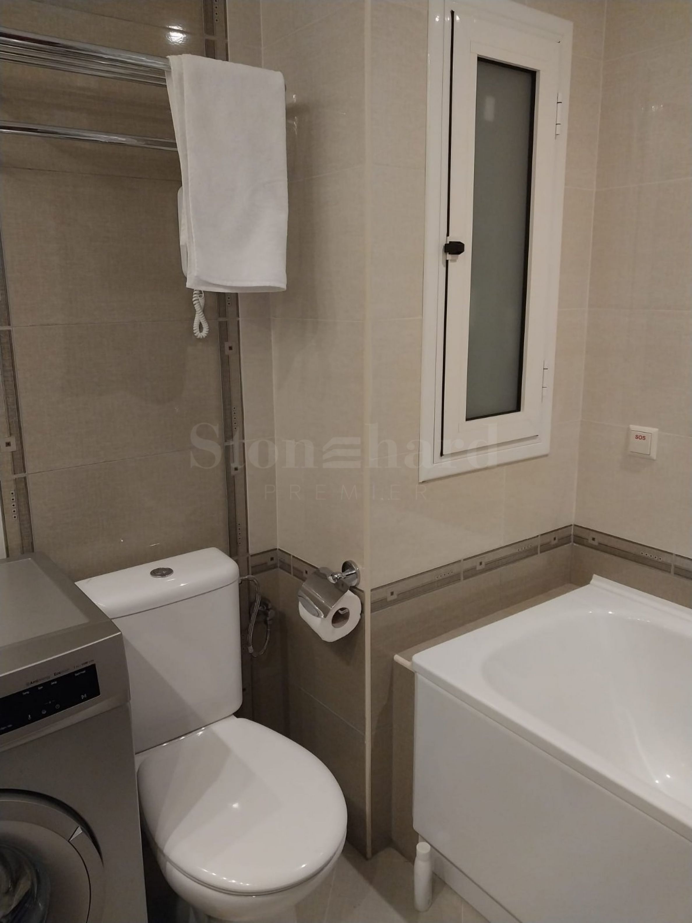 • Spacious bathroom with washing machine, bathtub and toilet.