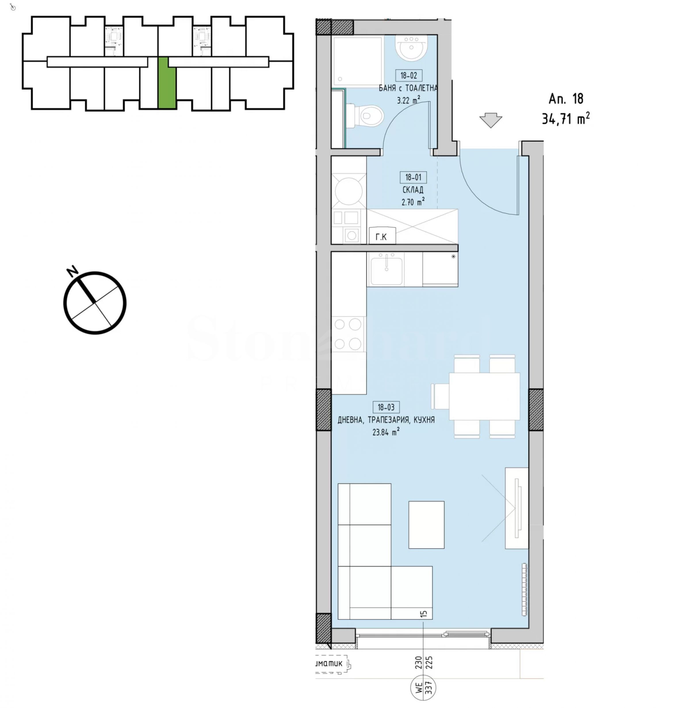 The apartment is located on the 3rd of four floors, has a total area of 41.12 sq m and consists of an entrance hall, bathroom/toilet, living room with kitchen.
