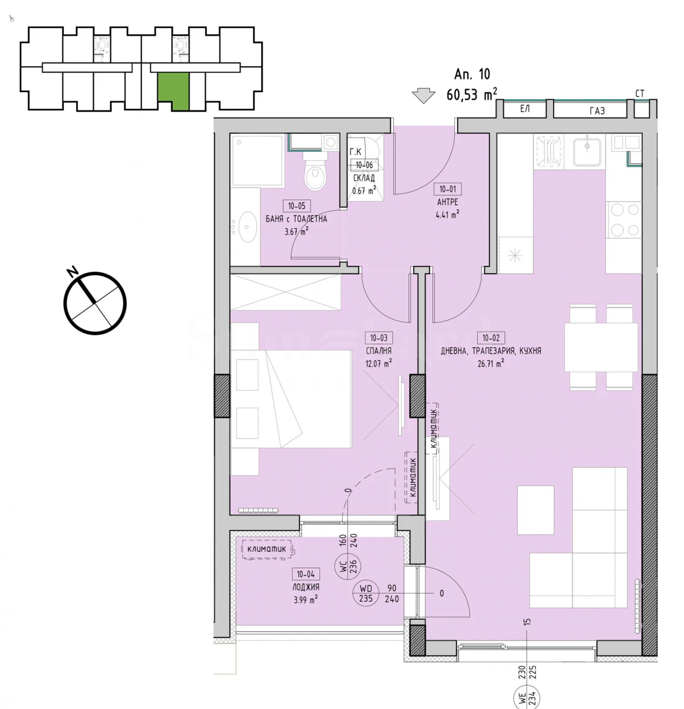The apartment is located on the 2nd of four floors, has a total area of 71.7 sq m and consists of an entrance hall, bathroom/toilet, living room with kitchen, one bedroom, and a terrace with access from both rooms.