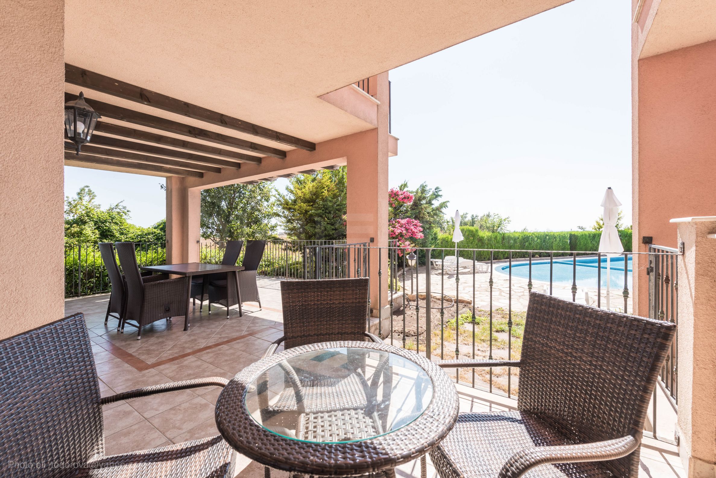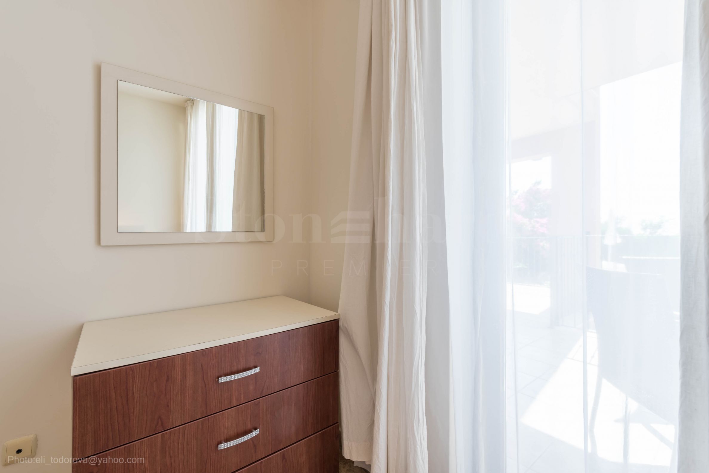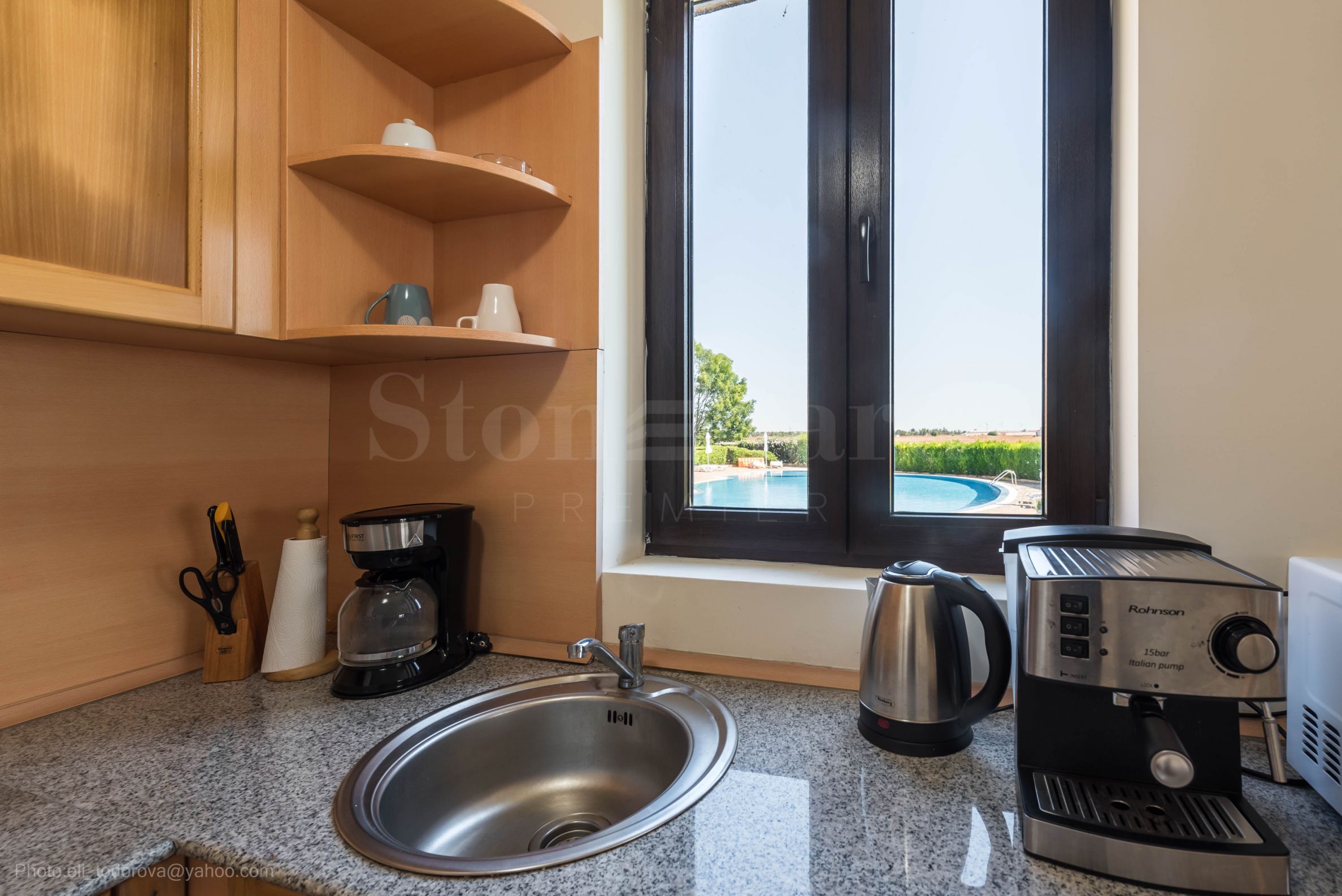 The property has an area of 146.12 m2 and consists of an entrance hall, a living room with a kitchen, two bedrooms, two bathrooms with a toilet (both equipped with bathtubs), a fireplace and a terrace. It is offered for sale fully furnished and with a built-in kitchen, furnished bedrooms, as well as equipped bathrooms. The spacious veranda gives the opportunity to place garden furniture where you can enjoy outdoor evenings. It has access to the two smaller, private pools in the complex, which guarantee you a peaceful holiday. The other option is to take advantage of the main infinity pool where the bar is located.