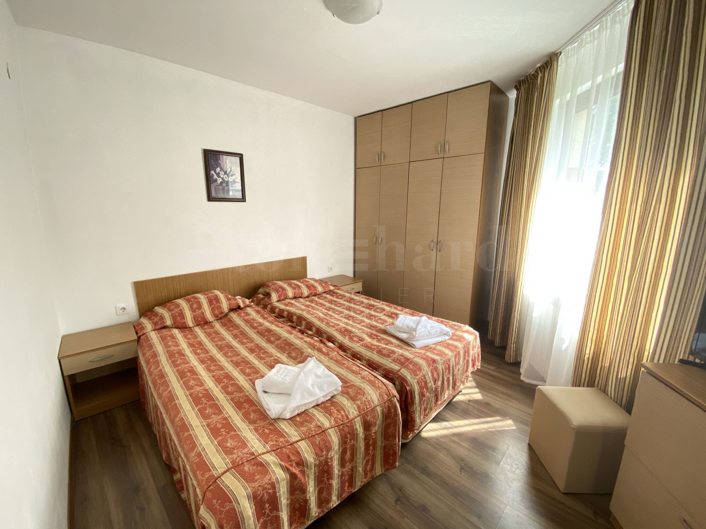 Living room equipped with electric stove, refrigerator, hood and all necessary appliances and utensils. The bedroom has two single mattresses, bedside tables, wardrobe and TV. The floors are laminate. The apartment is heated by central heating.