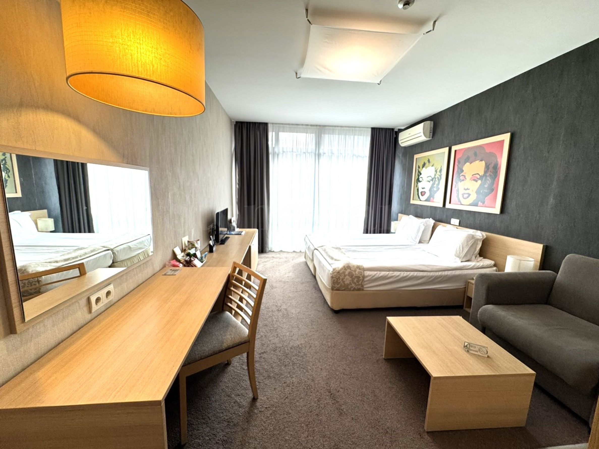 Apartament składa się z korytarza, kuchni, dwóch pojedynczych materacy, fotela, stolika kawowego, szafy i telewizora.