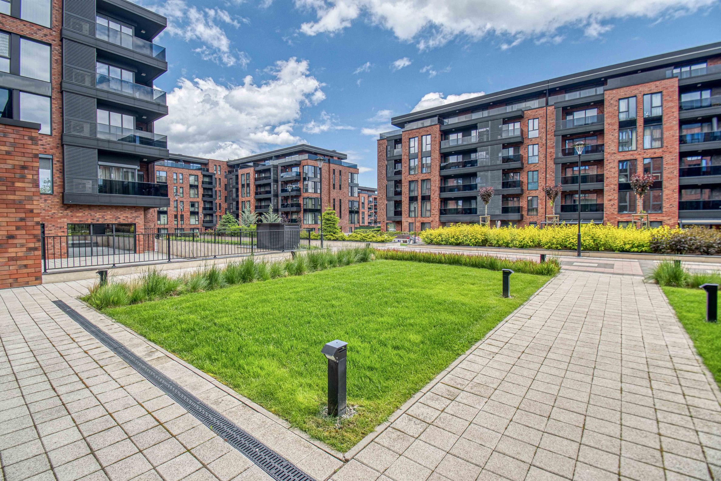 Całkowicie podziemny parking na dwóch poziomach zapewnia środowisko wolne od ruchu na wewnętrznym dziedzińcu. Kompleks ma kontrolowany dostęp, monitoring wideo i mobilny patrol 24/7, a konserwacją zajmuje się profesjonalna firma pod kontrolą inwestora.
