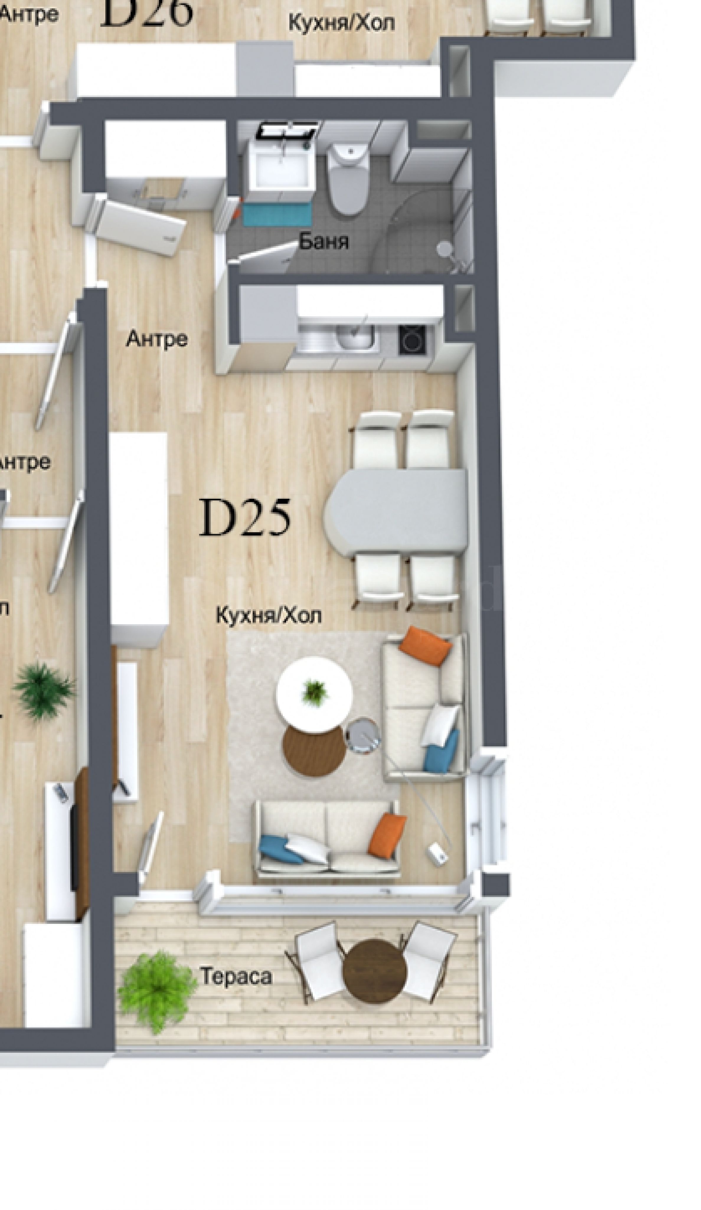 Nieruchomość o powierzchni całkowitej 47,52 m² znajduje się na drugim piętrze budynku mieszkalnego i ma ekspozycję południowo-zachodnią. Składa się z przedpokoju, łazienki/WC, salonu z kuchnią oraz tarasu. Zdjęcia w ofercie są przykładowe, wspólne dla całego kompleksu.